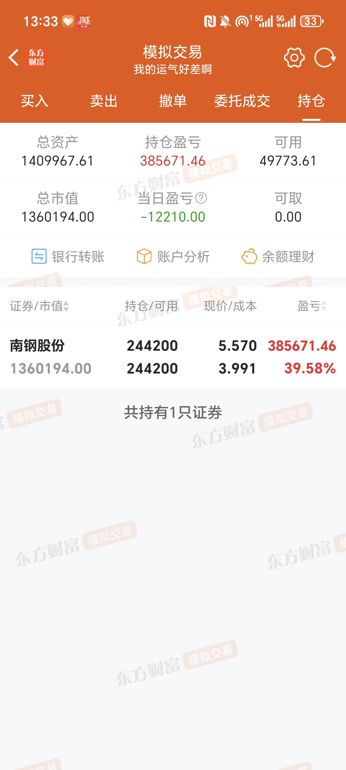 虽然是模拟盘,但是我好像记得是五月份买入的,半年我一直没看,如果做t的话保守一半收益,后悔没有实盘。我想说的是,陌生人,如果你看好某一只股票,那么就买入持有,不久的未来相信它能够给你带来好运,加油大家