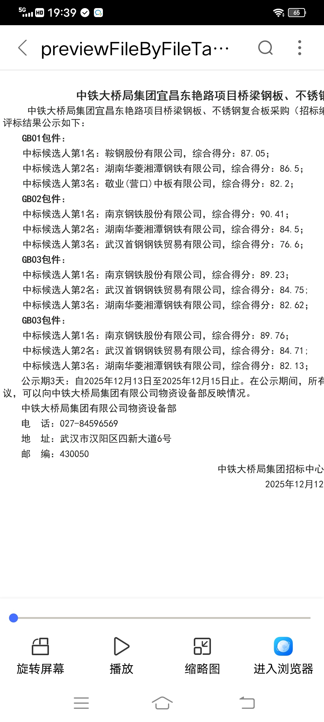 $南钢股份(SH600282)$ 南钢股份: 中铁大桥局集团宜昌东艳路项目桥梁钢板、不锈钢复合板采购中标候选人公示