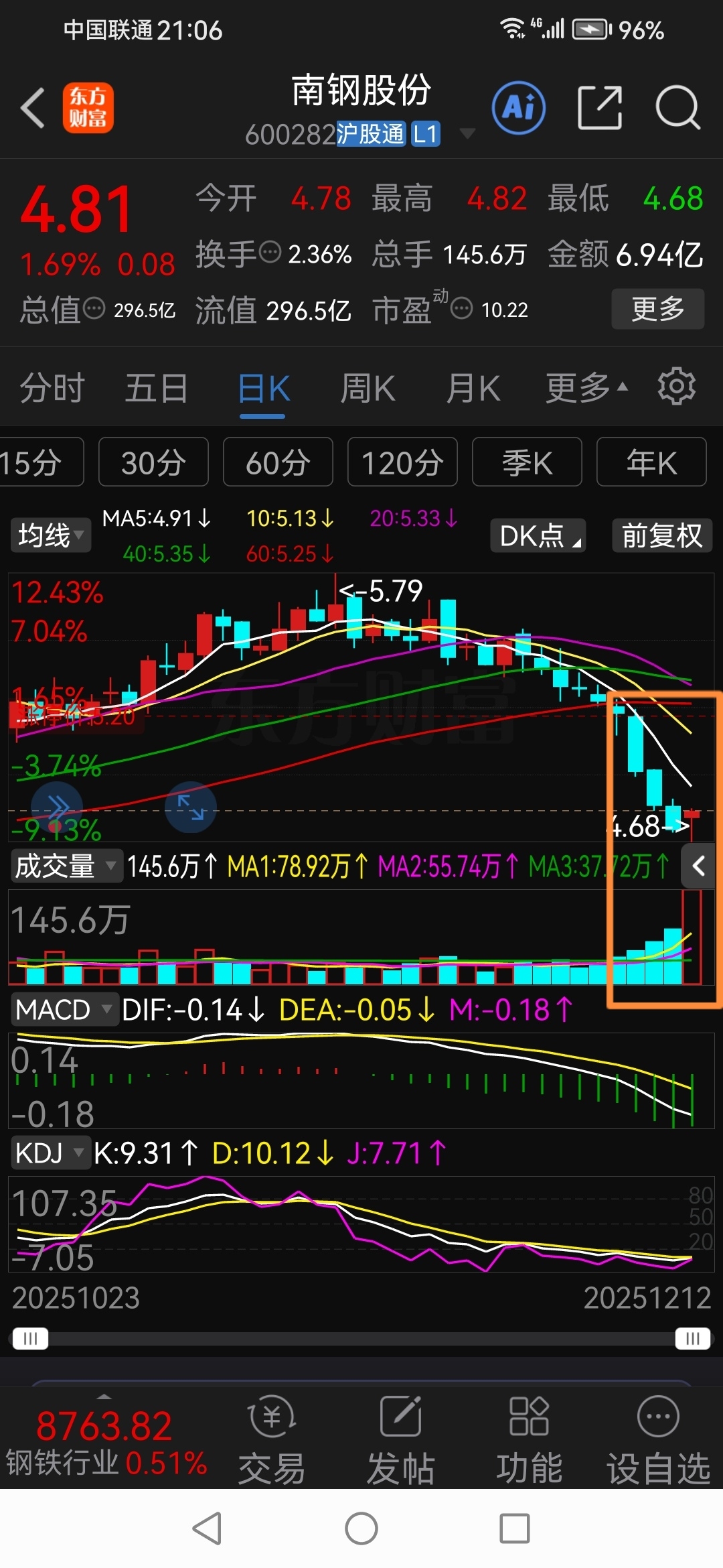 $南钢股份(SH600282)$ 成交量在底部连续5天密集放大,今天换手率达2.36%,是平常的3倍,说明恐慌盘已杀出,主力已承接,今天4.68元就是近期调整的最低价,大家周一赶快加仓。