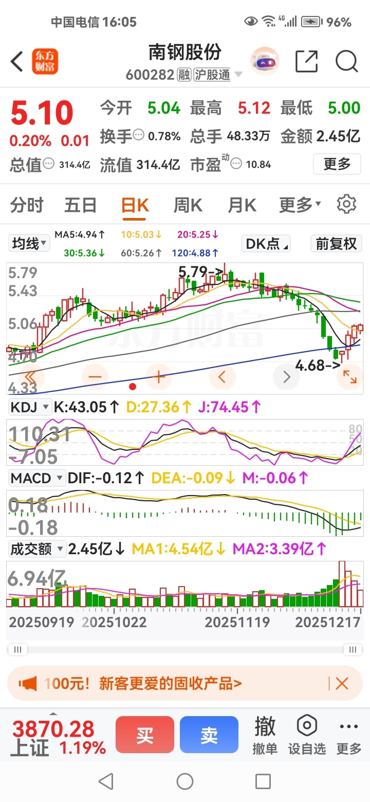 $南钢股份(SH600282)$ 超跌反弹这周应该差不多到顶了,不放量就是快要拐头向下了