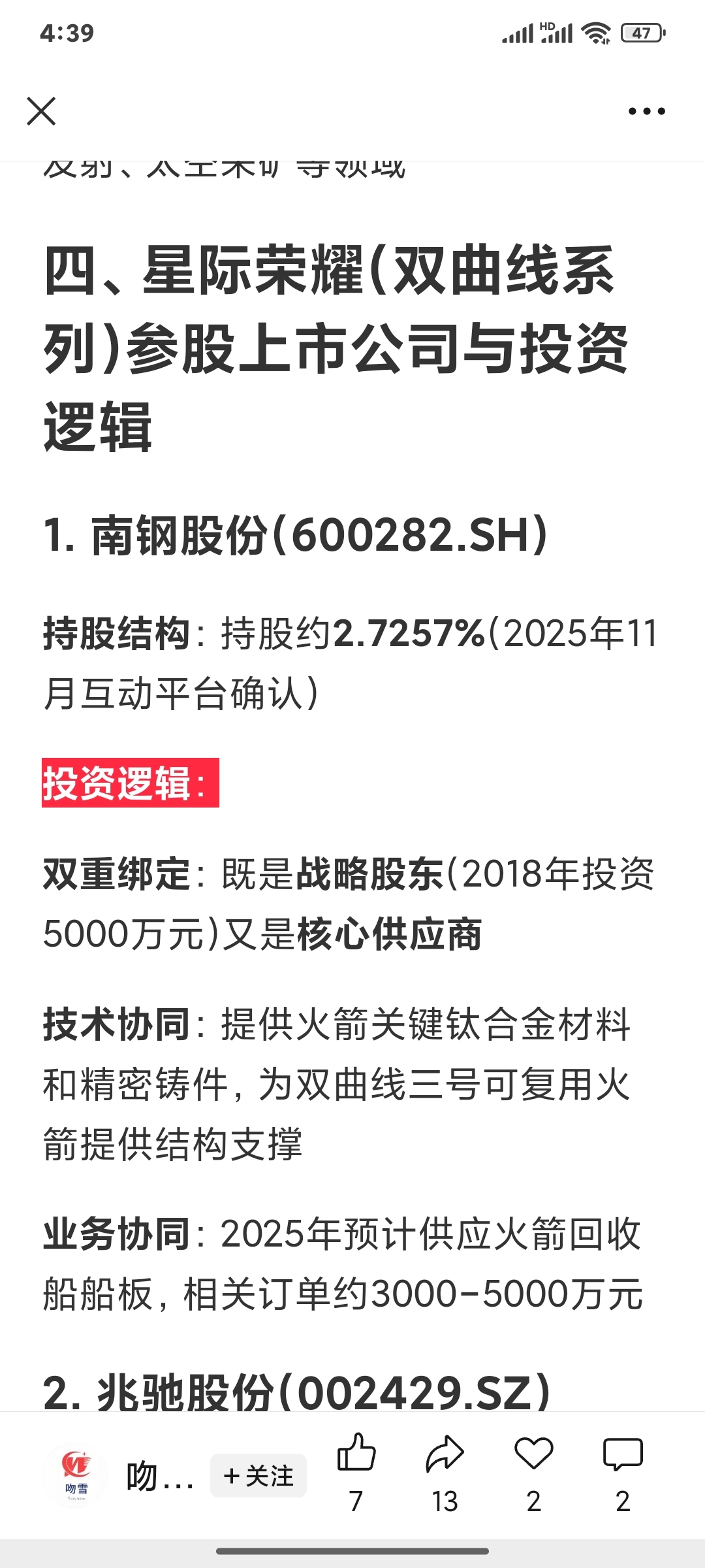南钢股份即是星际荣耀的股东又向星际荣耀提供钛合金材料。紧固件及可回收船板。这个价