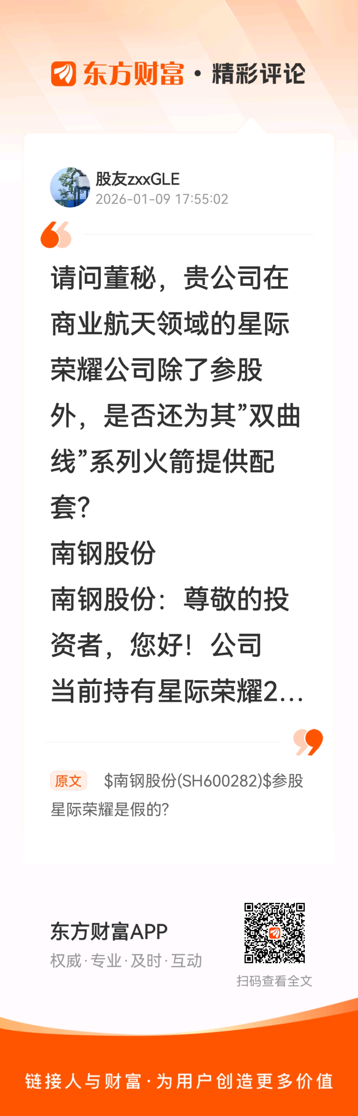 2.31的股份不少了//@股友zxxGLE :请问董秘,贵公司在商业航天领域的星际荣耀公司除了参股外,是否还为其”双曲线”系列火箭提供配套?南钢股份南钢股份:尊敬的投资者,您好!公司当前持有星际荣耀2.31%的股权。公司为火箭回收船供应船板。感谢您对公司的关注!(来自上证e互动)答复时间 2025-12-25 11:29:00