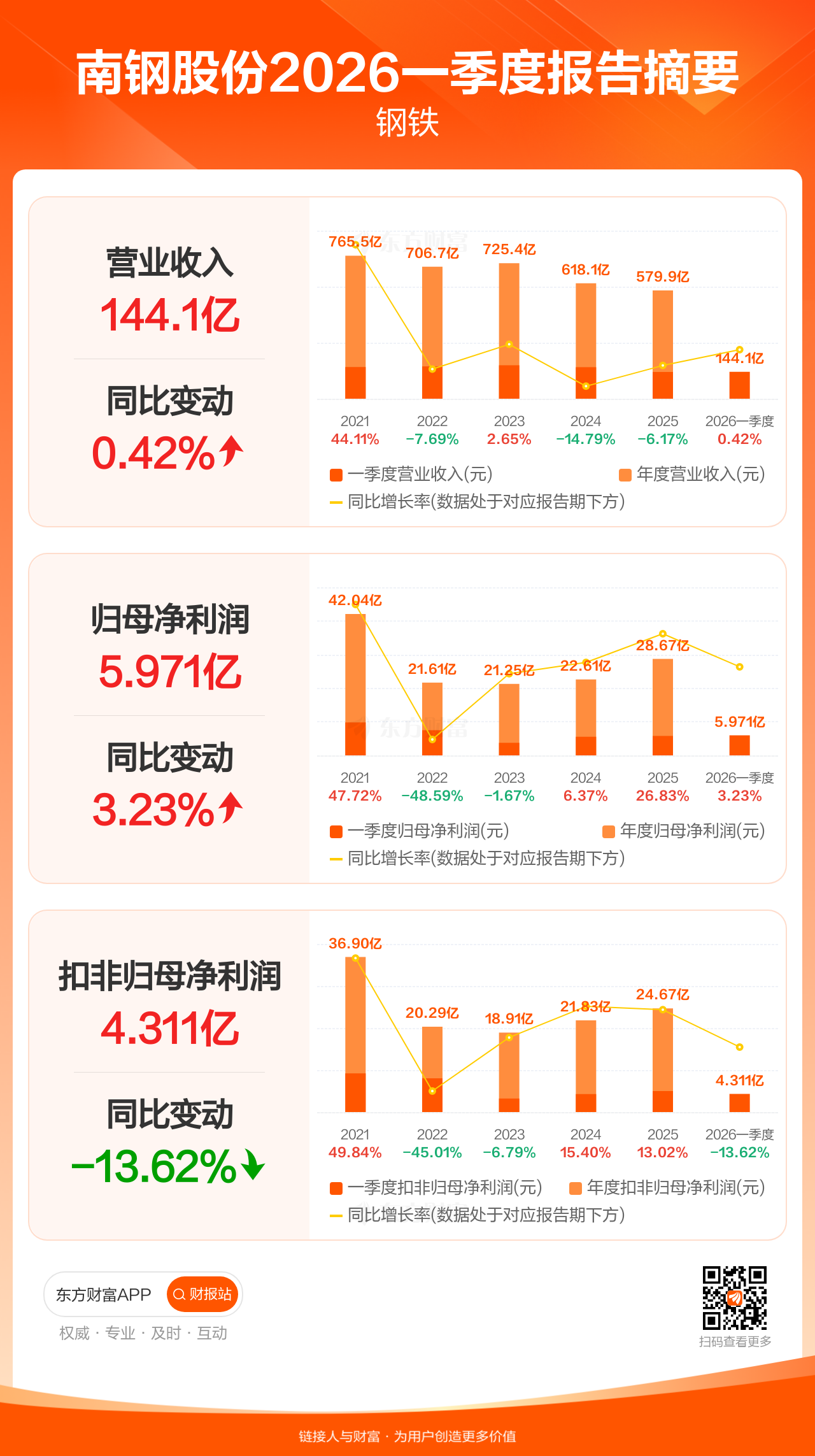 南钢股份4月23日发布2026年一季报显示,公司一季度实现营业收入144.14亿元,同比增长0.42%;归母净利润5.97亿元,同比增长3.23%;扣非归母净利润4.31亿元,同比下滑13.62%。