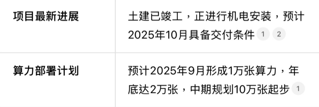 $浦东建设(SH600284)$ 控股子公司上海浦算云智科技服务有限公司该黎明智算项目土建已竣工,正进行机电安装,预计2025年10月具备交付条件。算力部署计划 预计2025年9月形成1万张算力,年底达2万张,中期规划10万张起步。预算2026年将撬动2600亿的市场。