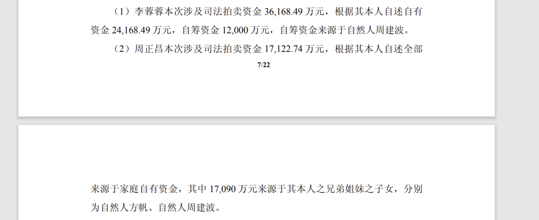 周建波是周正昌的亲属,据周正昌自述,其本次涉及司法拍卖资金1.71亿元全部来自家庭自有资金,其中绝大部分来源于其兄弟姐妹的子女,分别为自然人方帆、周建波。简单换算,减去其兄弟姐妹的子女提供的资金后,周正昌自己出资仅约32.74万元。