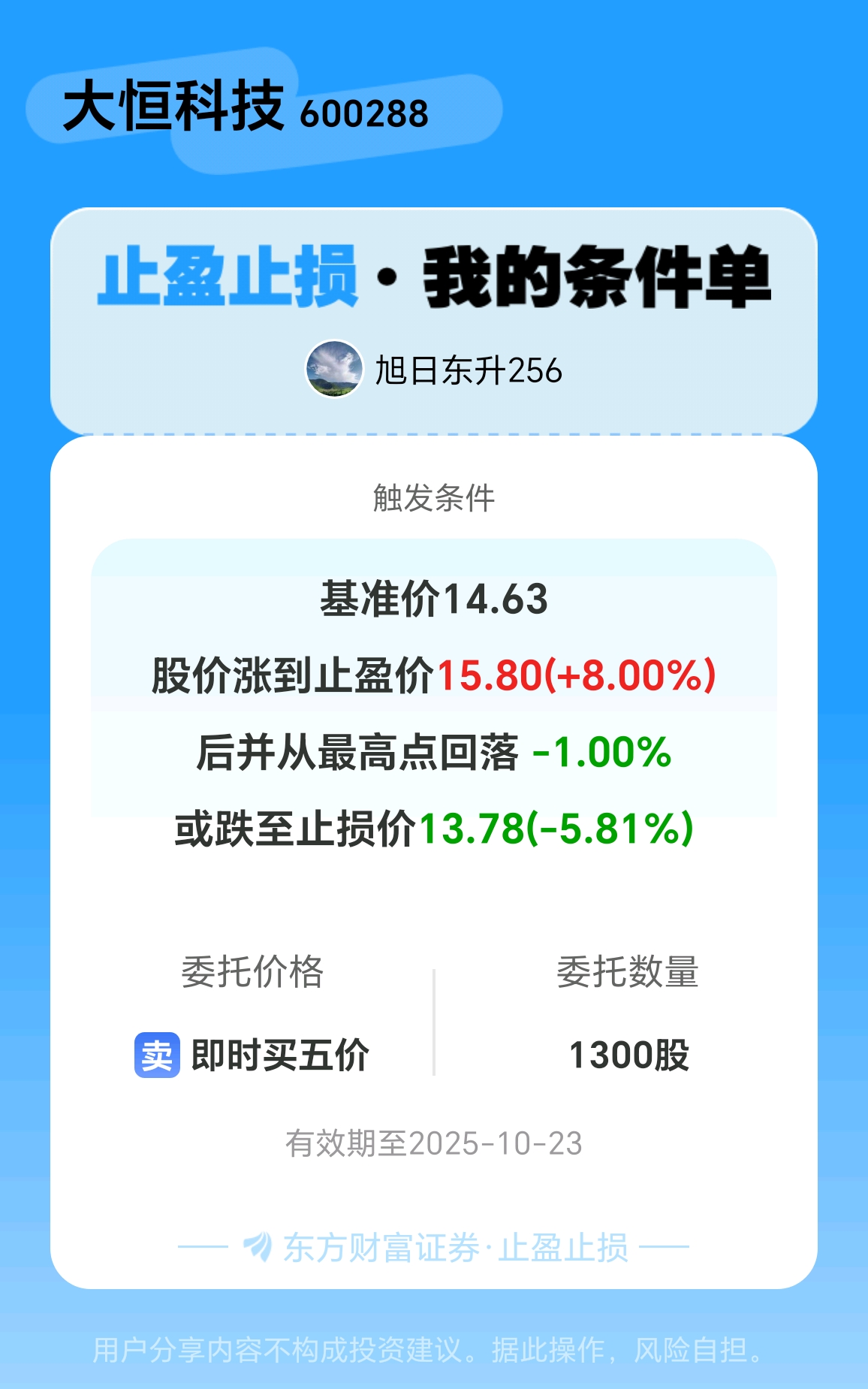 #条件单交流# #止盈止损晒单# 一位股神设置了一个止盈止损条件单,接下来就是见证奇迹的时刻~$大恒科技(SH600288)$