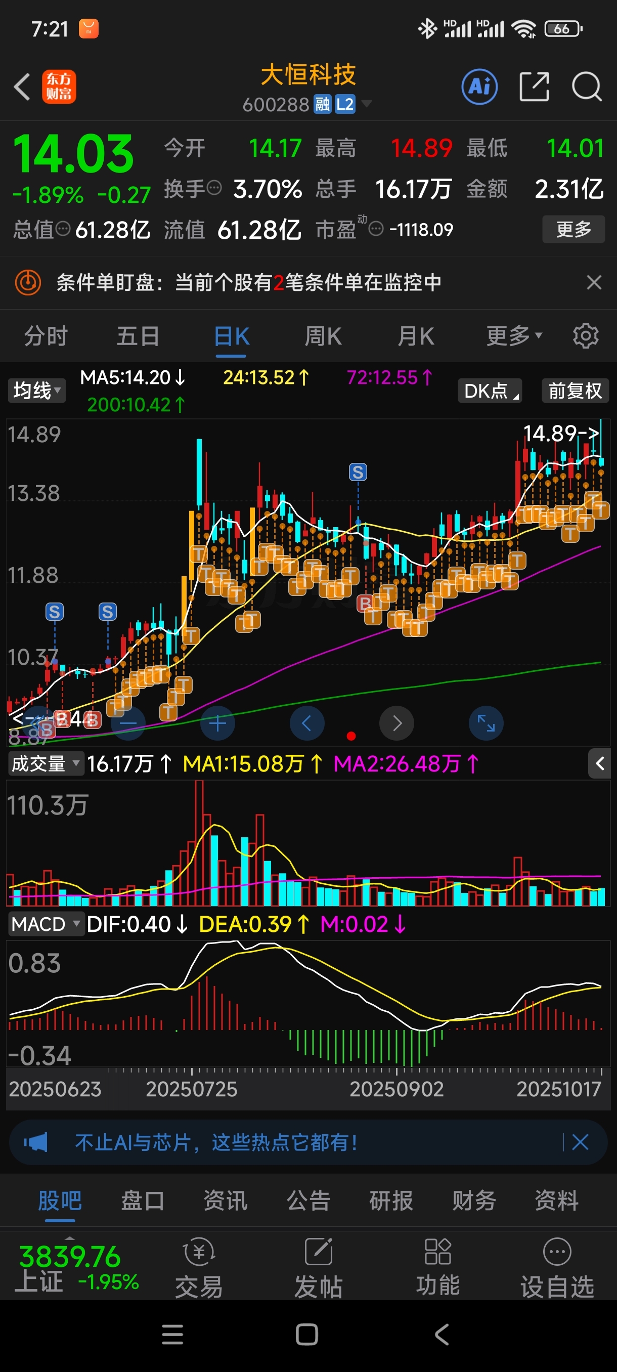 $大恒科技(SH600288)$ 我有一种强烈的预感,周一15.43元巨量开盘!