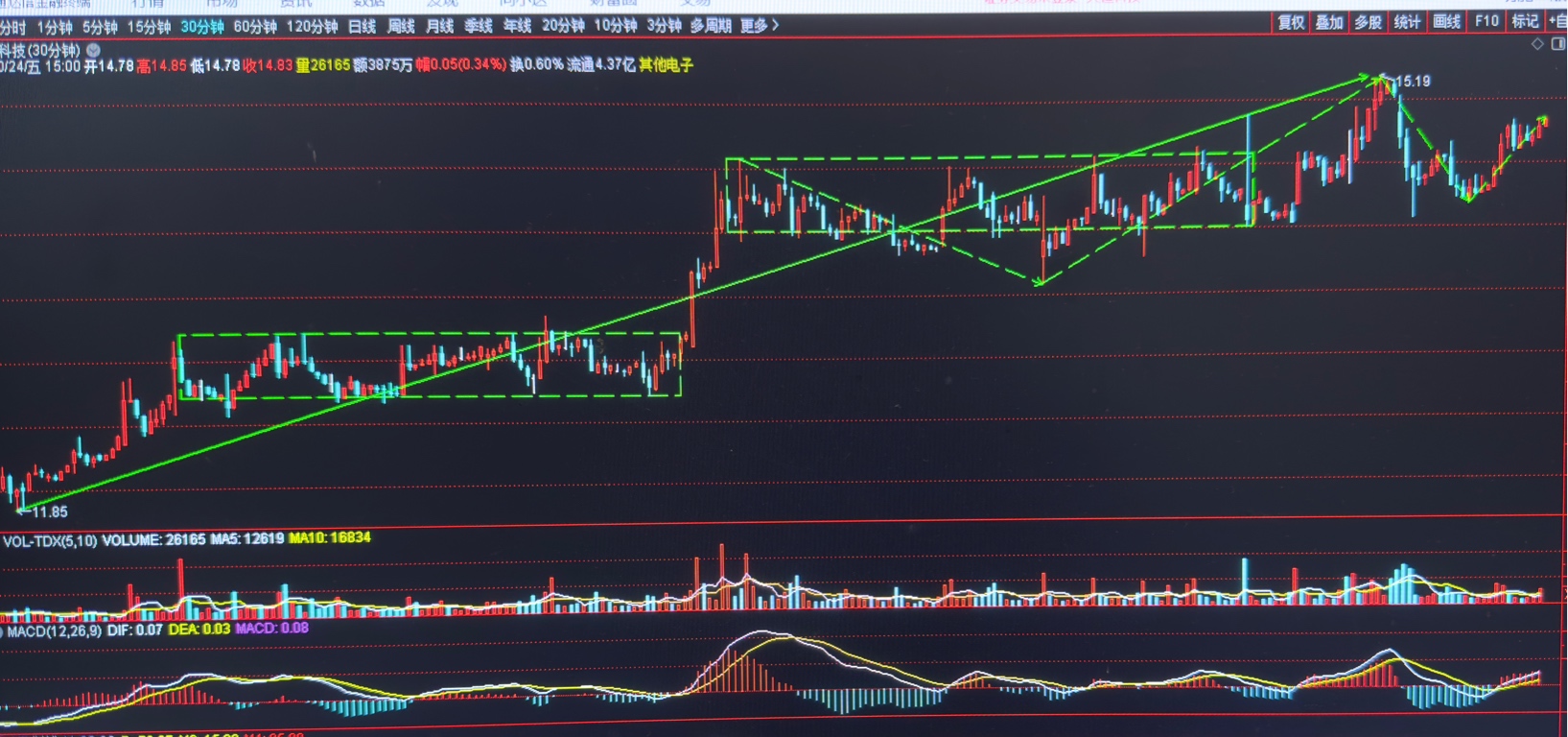 大恒科技当前这个30分钟线段上涨,内部是很清晰的5分钟趋势走势。15.19作为该