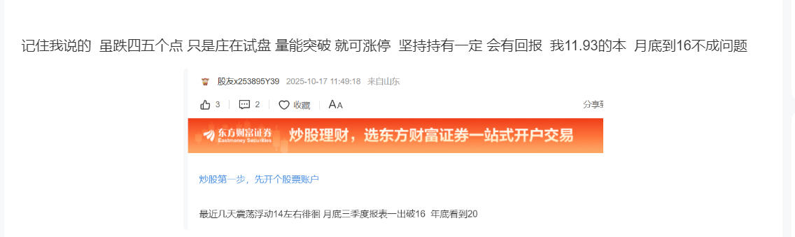 温馨提示: 1.根据《证券法》规定,禁止编造、传播虚假信息或者误导性信息,扰乱证券市场;2.用户在本社区发表的所有资料、言论等仅代表个人观点,与本网站立场无关,不对您构成任何投资建议。用户应基于自己的独立判断,自行决定证券投资并承担相应风险。《东方财富社区管理规定》