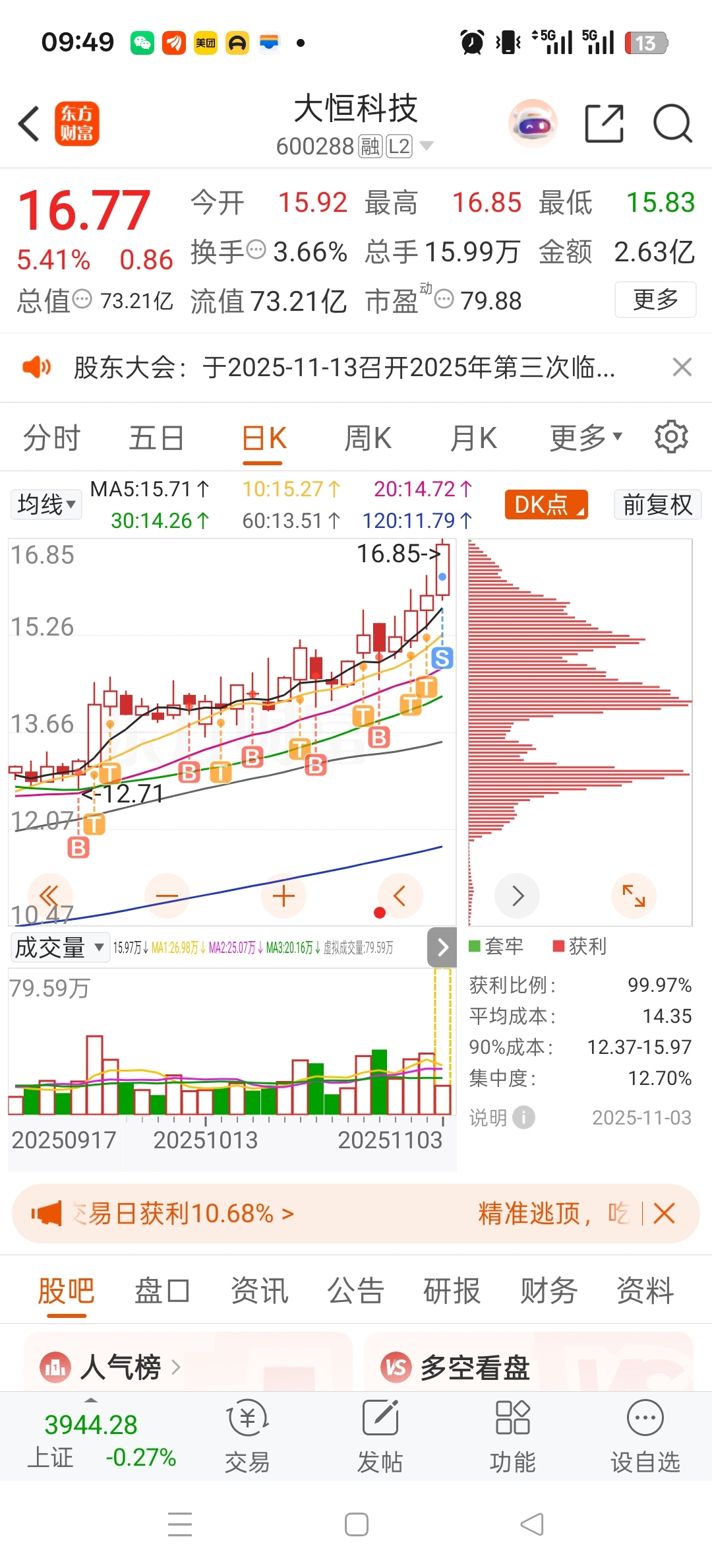 四连阳,风险大于收益,已减重仓操作,虽说没放量,但还是需要预防短期调整,各位看法