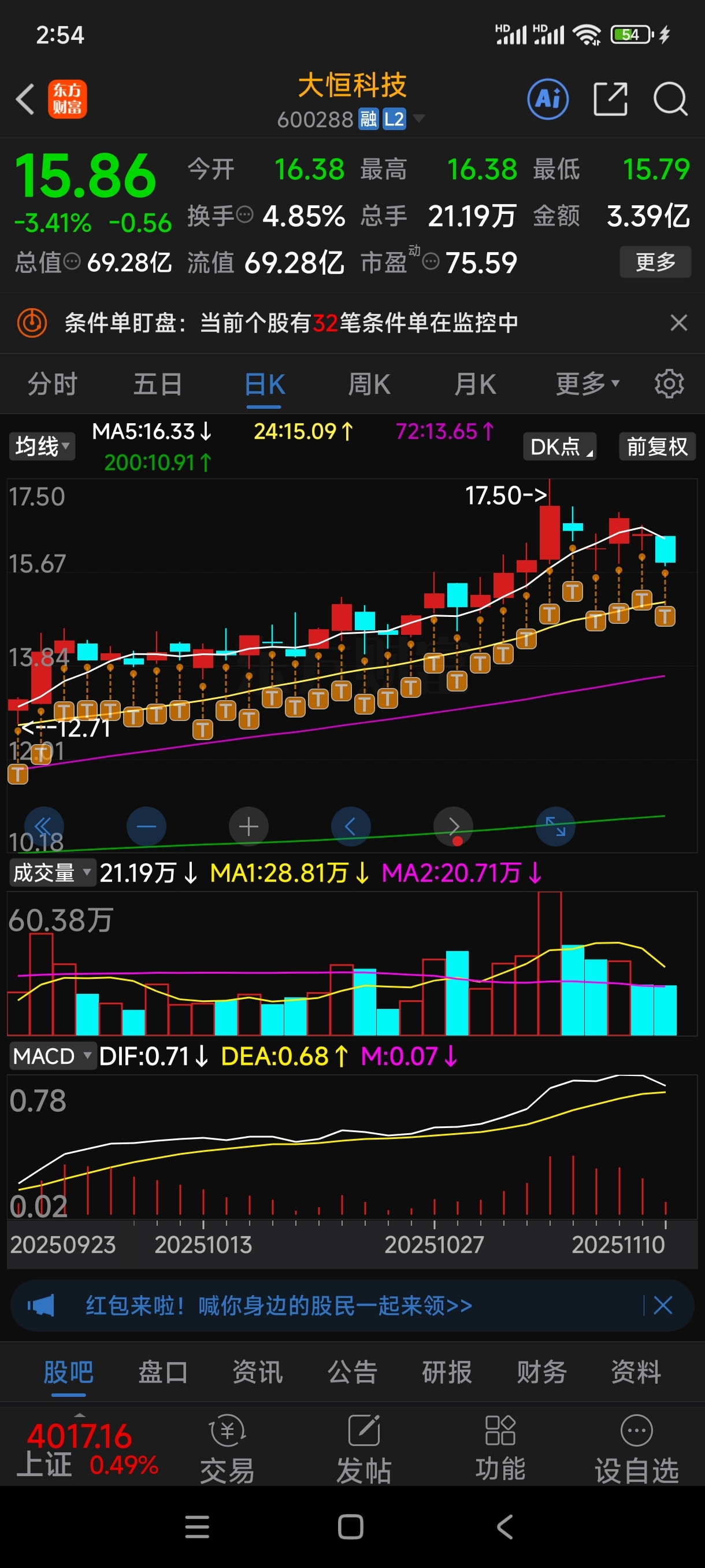 $大恒科技(SH600288)$ 不出意外的话,明天光脚长阳涨停板,期待已久的主升浪要开始了!