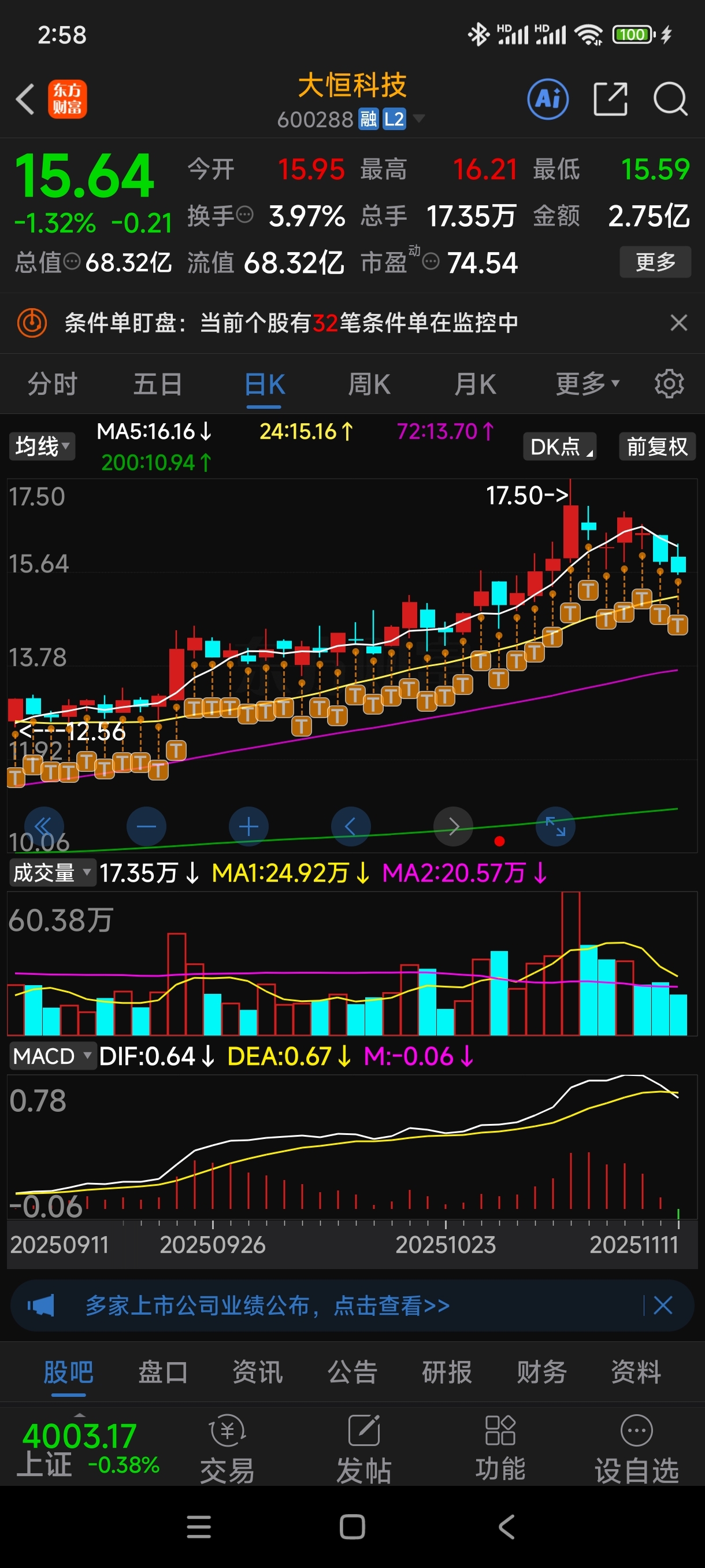 $大恒科技(SH600288)$ 这周真正考验是24日生命线!