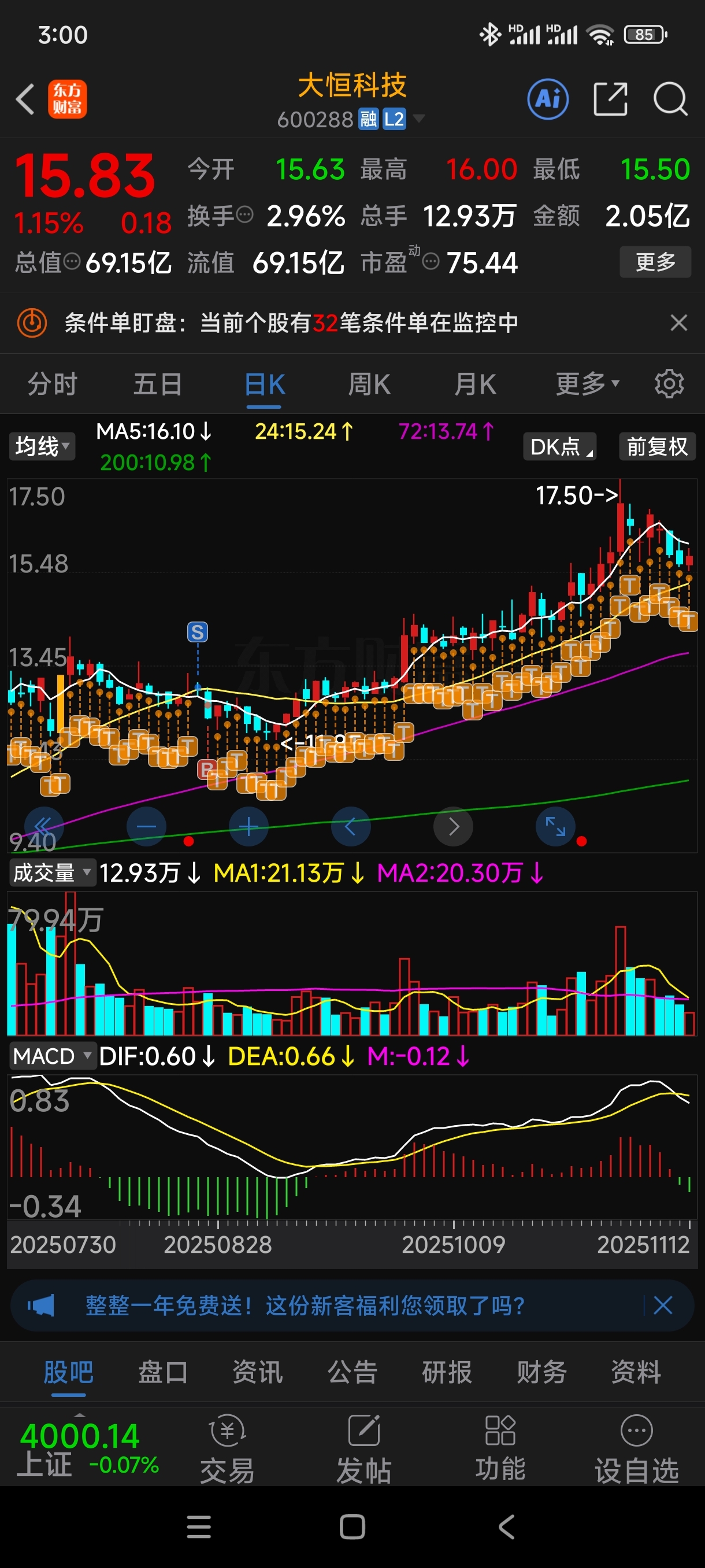 $大恒科技(SH600288)$ 明后两个交易日,考验24日生命线。