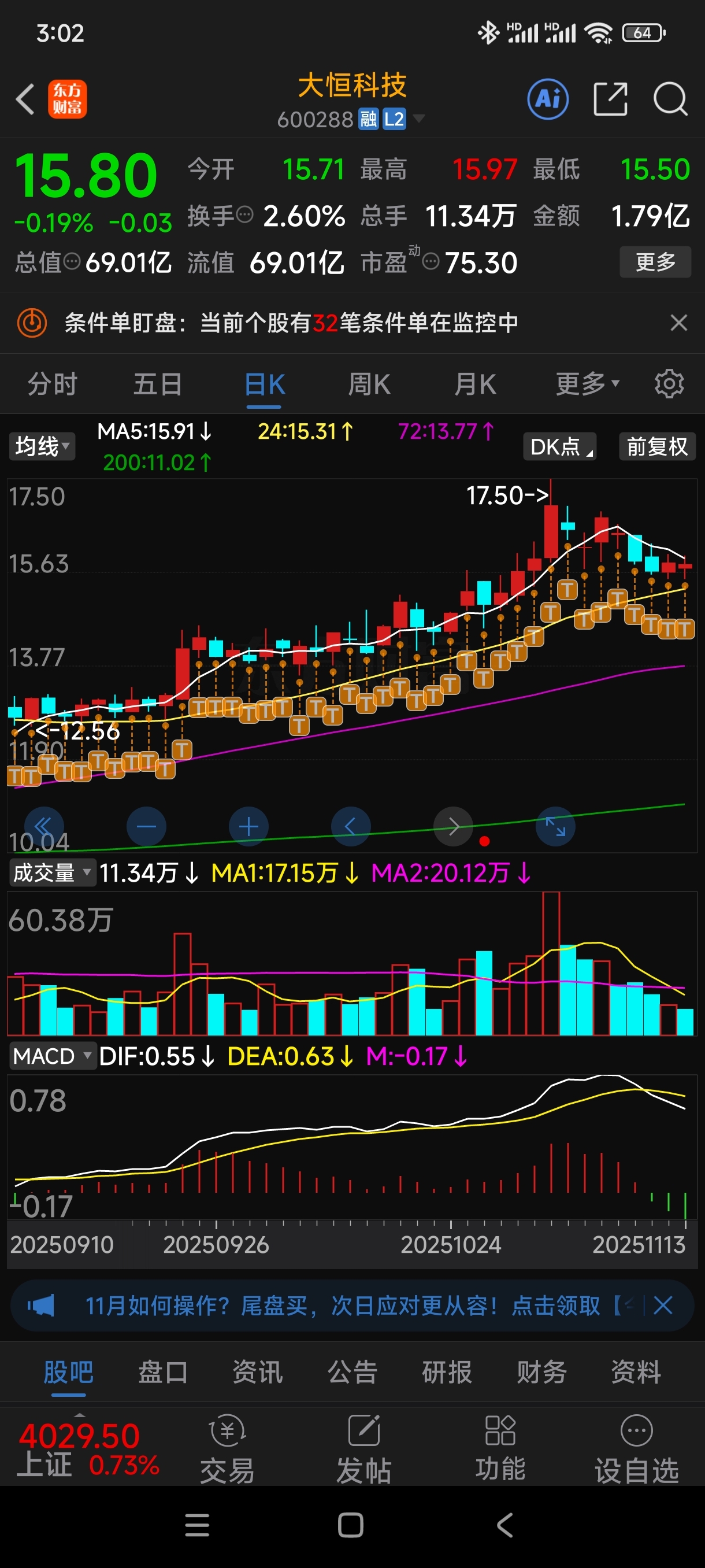 $大恒科技(SH600288)$ 缩量,明日继续考验24日生命线!