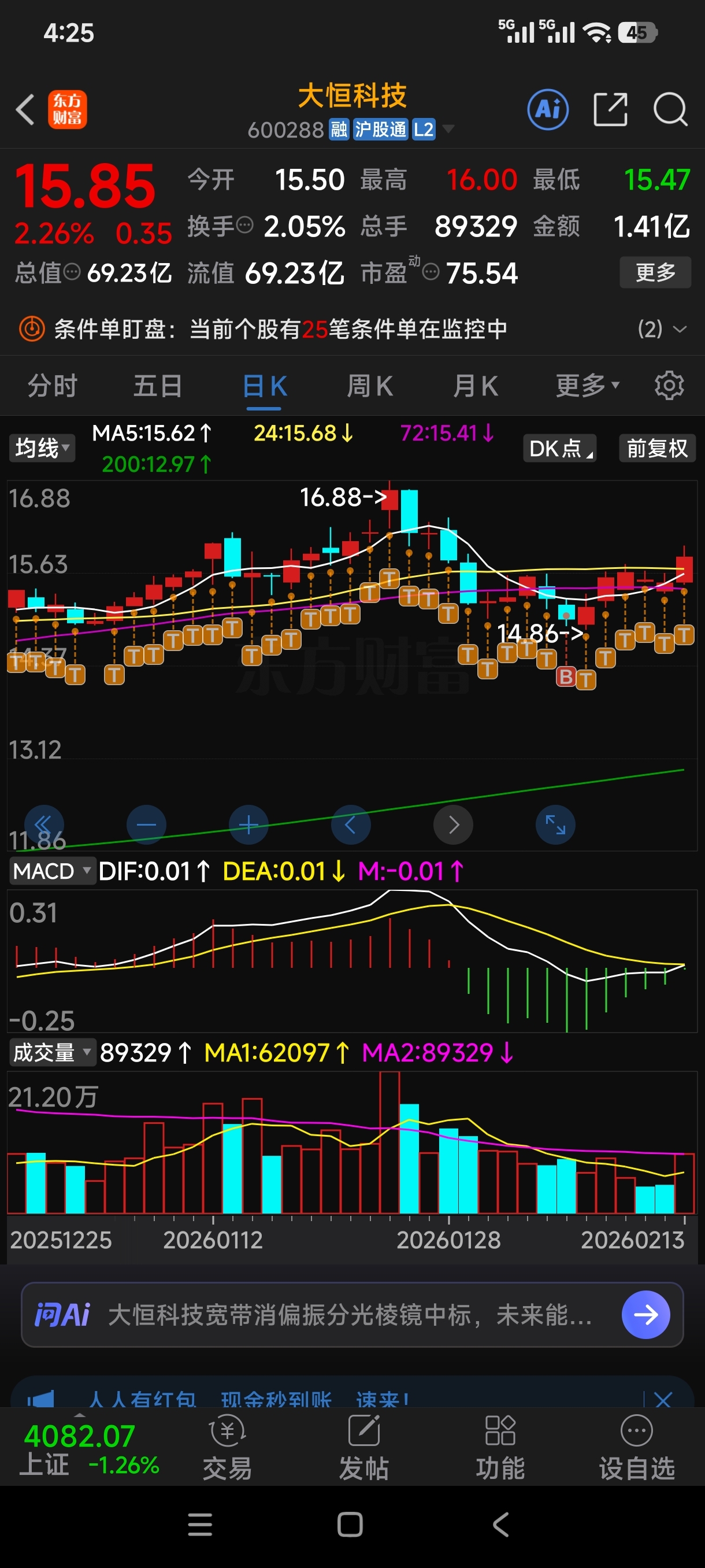 $大恒科技(SH600288)$ 大恒科技今日一阳穿两线,一举站上24日生命线,多头趋势初显,科技赛道蓄势待发。