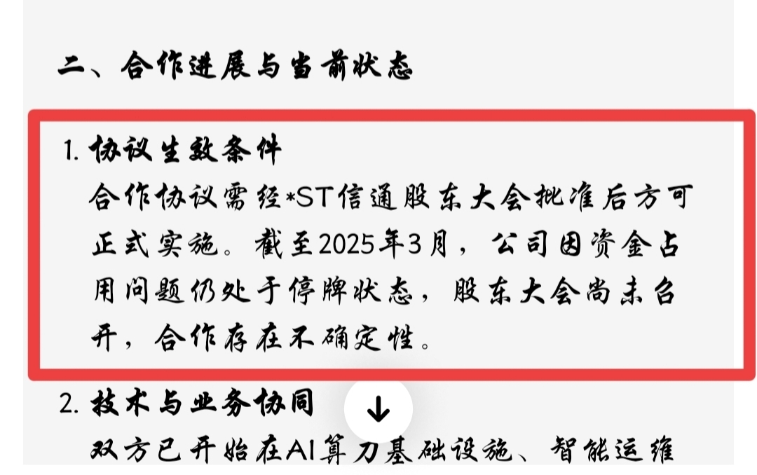 $*ST信通(SH600289)$ 看圈住的地方,合作存在不确定性,新韭菜还是先不要进了,再涨也涨不到哪里去,炒股都说炒预期,你觉得真摘帽了能有几个涨停,如果退市那可是裤衩都没了,个人观点,瞎掰掰的