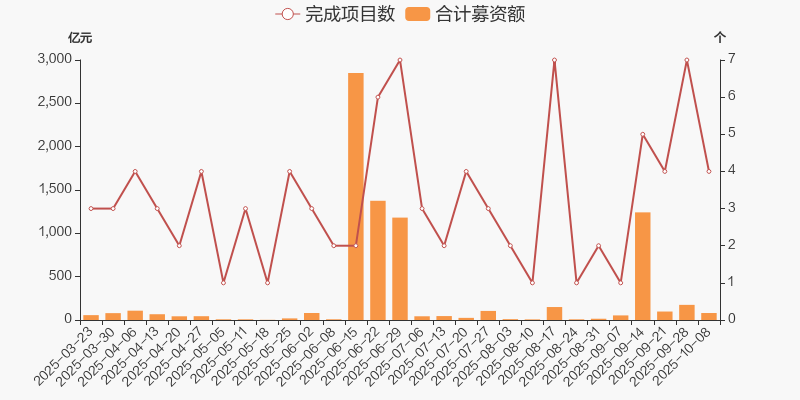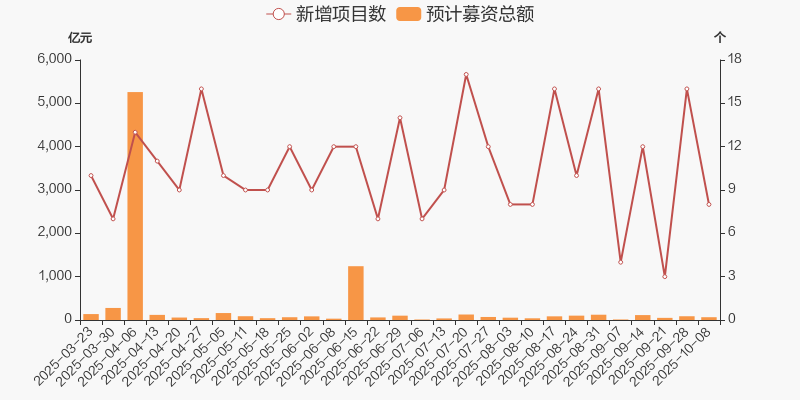 本周(2025/09/28-2025/10/08)共新增8例定增预案,预计募集资金共计64.36亿元,新增项目数量环比减少8例,预计募资总额环比降低22.18亿。