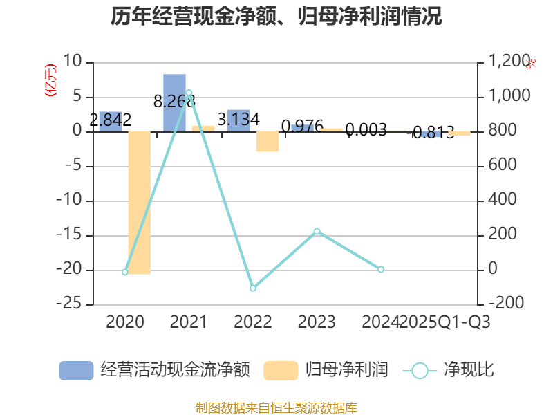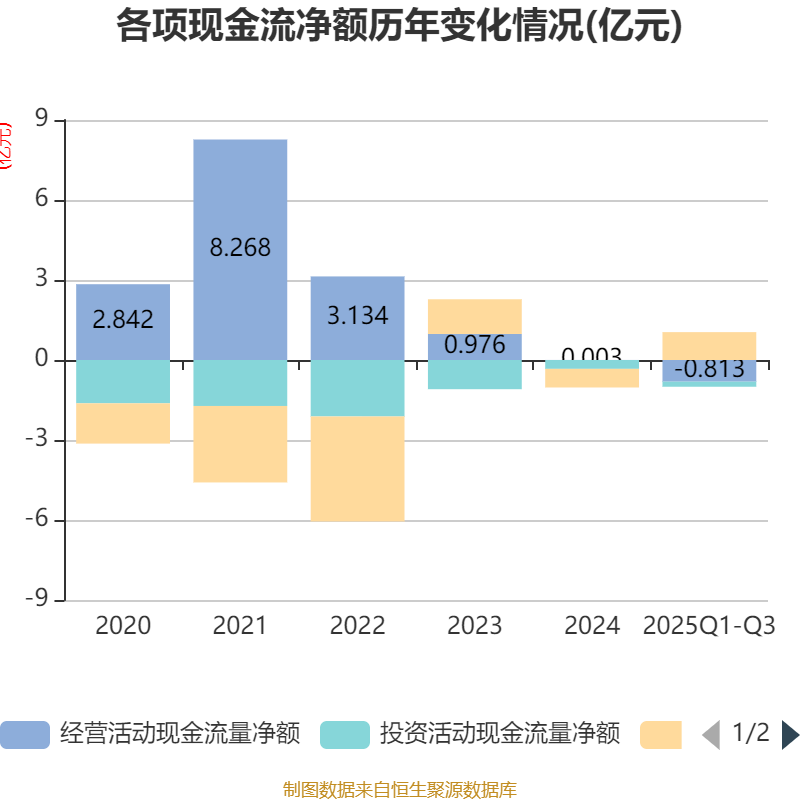 2025年前三季度,公司经营活动现金流净额为-8126.21万元,同比减少5991.01万元;筹资活动现金流净额1.05亿元,同比增加1.56亿元;投资活动现金流净额-1899.86万元,上年同期为-5778.55万元。