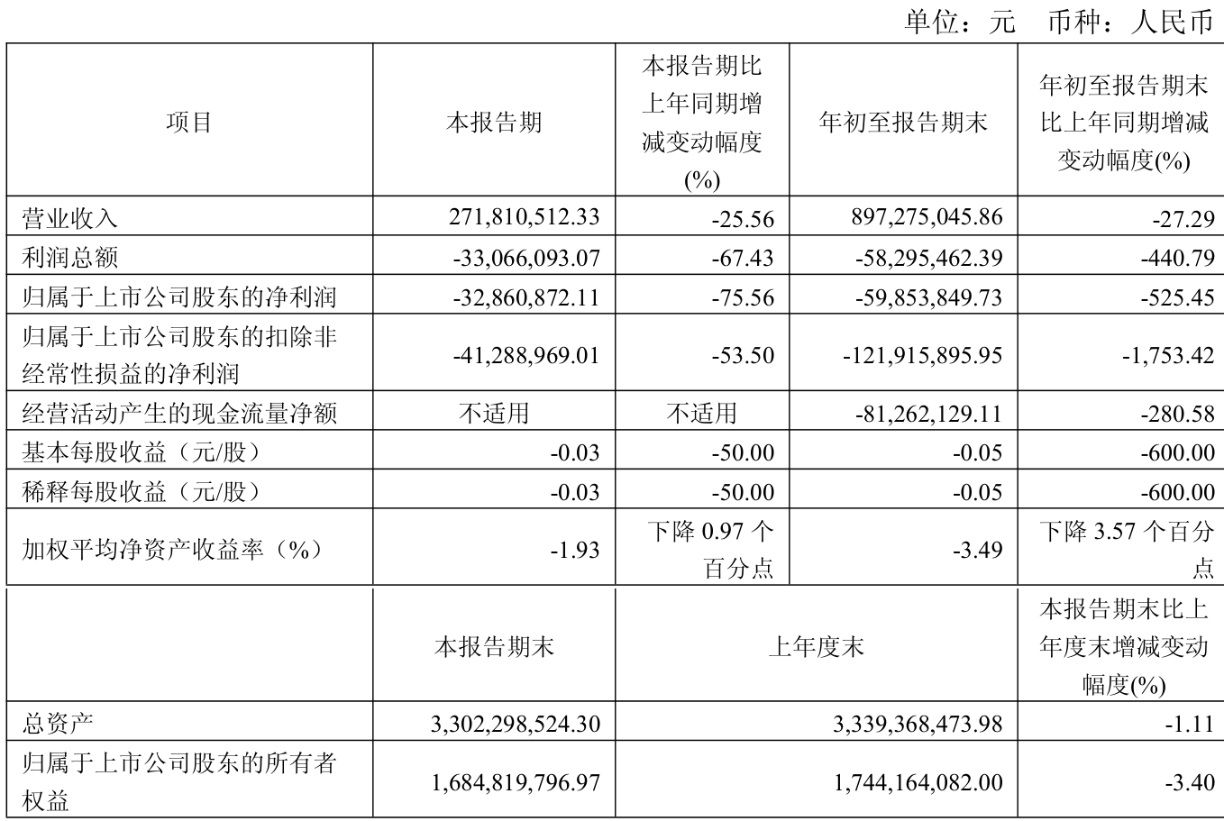 中证智能财讯三峡新材(600293)10月24日披露2025年第三季度报告。前三季度公司实现营业总收入8.97亿元,同比下降27.29%;归母净利润亏损5985.38万元,上年同期盈利1406.85万元;扣非净利润亏损1.22亿元,上年同期亏损657.79万元;经营活动产生的现金流量净额为-8126.21万元,上年同期为-2135.2万元;报告期内,三峡新材基本每股收益为-0.05元,加权平均净资产收益率为-3.49%。