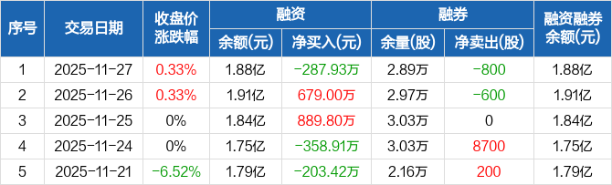 三峡新材:融资净偿还287.93万元,融资余额1.88亿元(11-27)