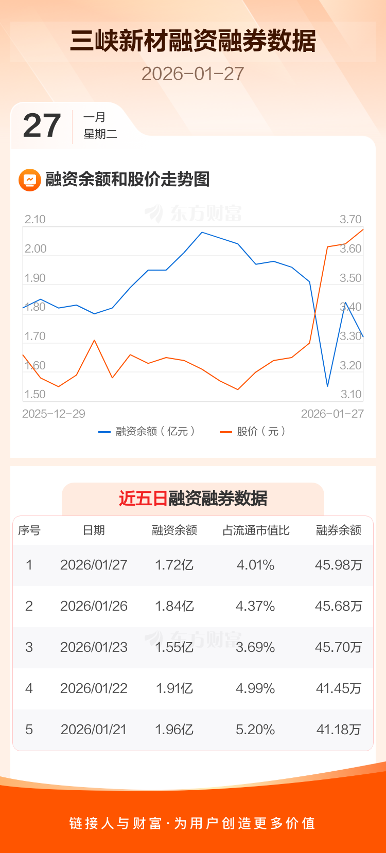 交易所最新数据显示,三峡新材于2026年1月27日获融资买入3579.63万元,融资偿还4849.05万元,当日融资净偿还1269.41万元。目前,该股融资余额1.72亿,占流通市值比例为4.01%。