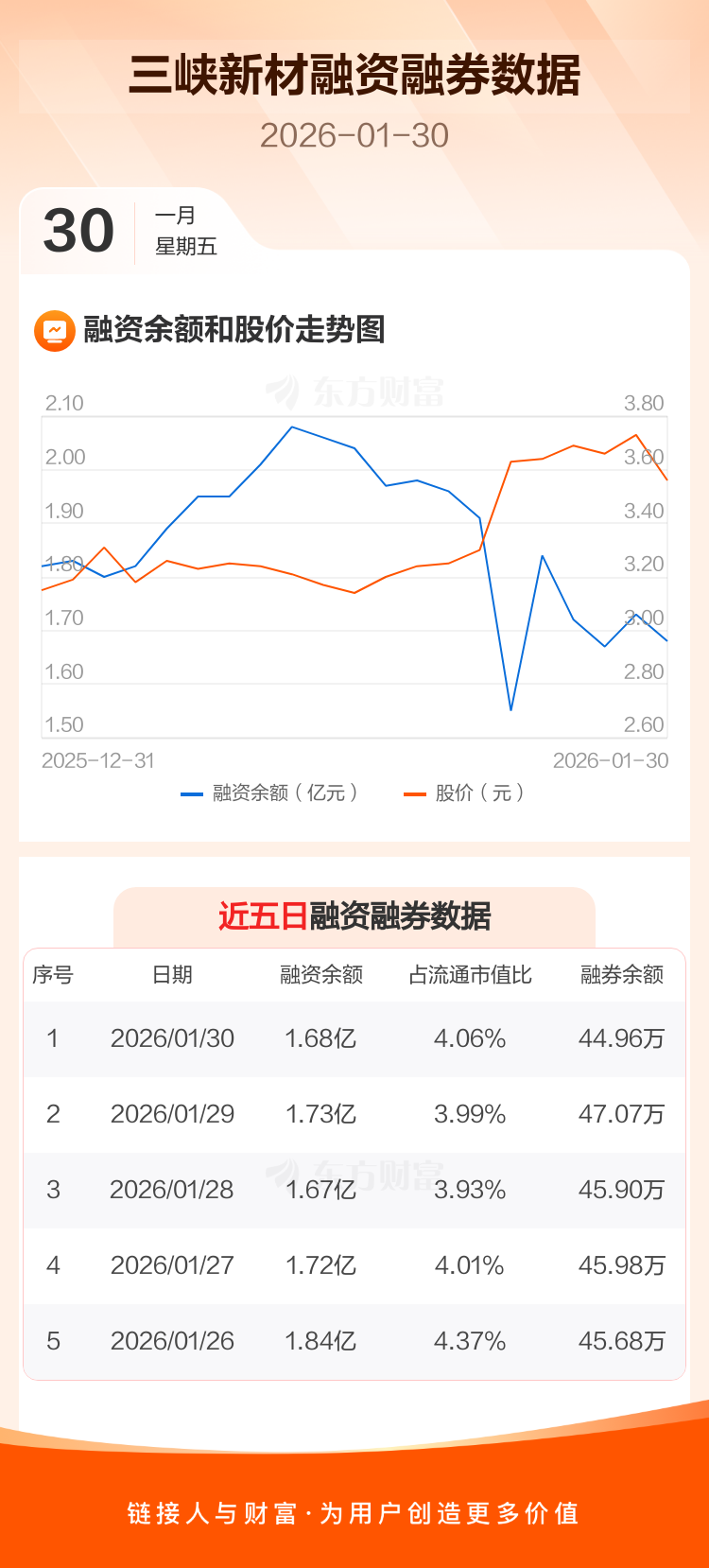 交易所最新数据显示,三峡新材于2026年1月30日获融资买入1941.27万元,融资偿还2417.78万元,当日融资净偿还476.51万元。目前,该股融资余额1.68亿,占流通市值比例为4.06%。