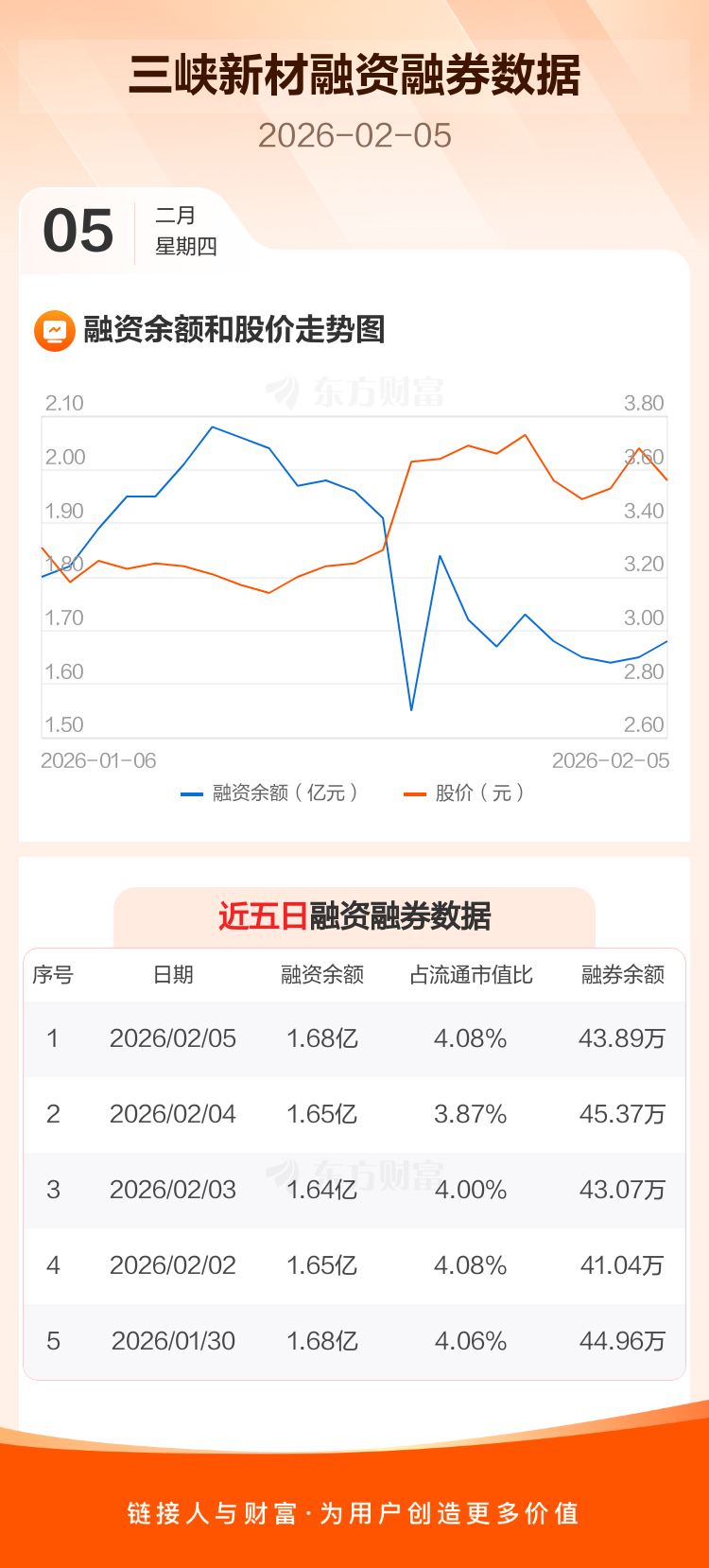 交易所最新数据显示,三峡新材于2026年2月5日获融资买入1747.37万元,融资偿还1408.67万元,当日融资净买入338.7万元。目前,该股融资余额1.68亿,占流通市值比例为4.08%。