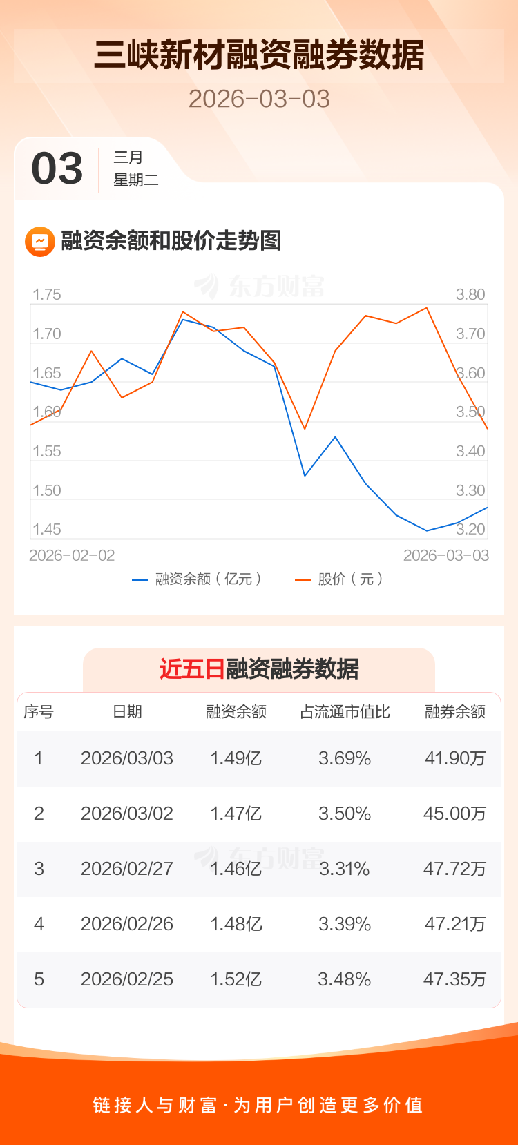 交易所最新数据显示,三峡新材于2026年3月3日获融资买入2113.76万元,融资偿还1912.29万元,当日融资净买入201.47万元。目前,该股融资余额1.49亿,占流通市值比例为3.69%。