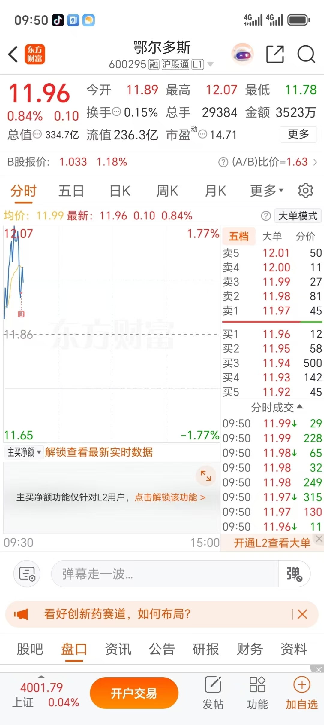 $鄂尔多斯(SH600295)$ 今日看好,己成功上车