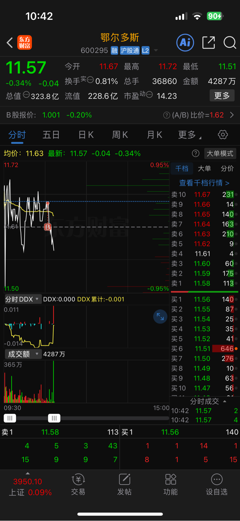 $鄂尔多斯(SH600295)$ 我真是服了 我就买了2万块钱就把你买崩了??? 幸好只是建仓
