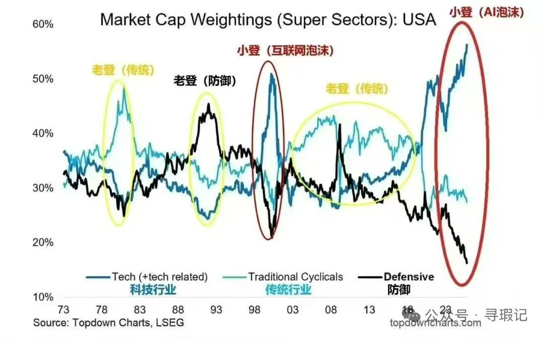 历史上科技股(小登)泡沫破灭时,消费、金融(老登)都会大涨,因为牛市吸引的大量资金总要找一个板块去抱团防御。