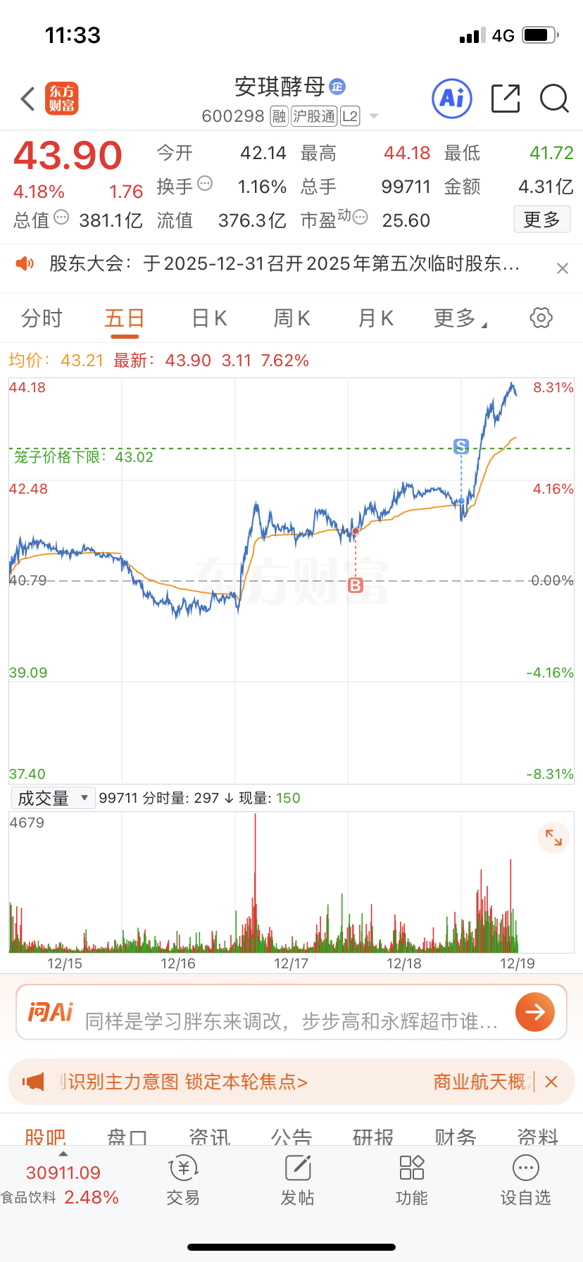 $安琪酵母(SH600298)$ 想着咬一口就跑,卖飞了,还好别的地方补回来了,还是少赚了