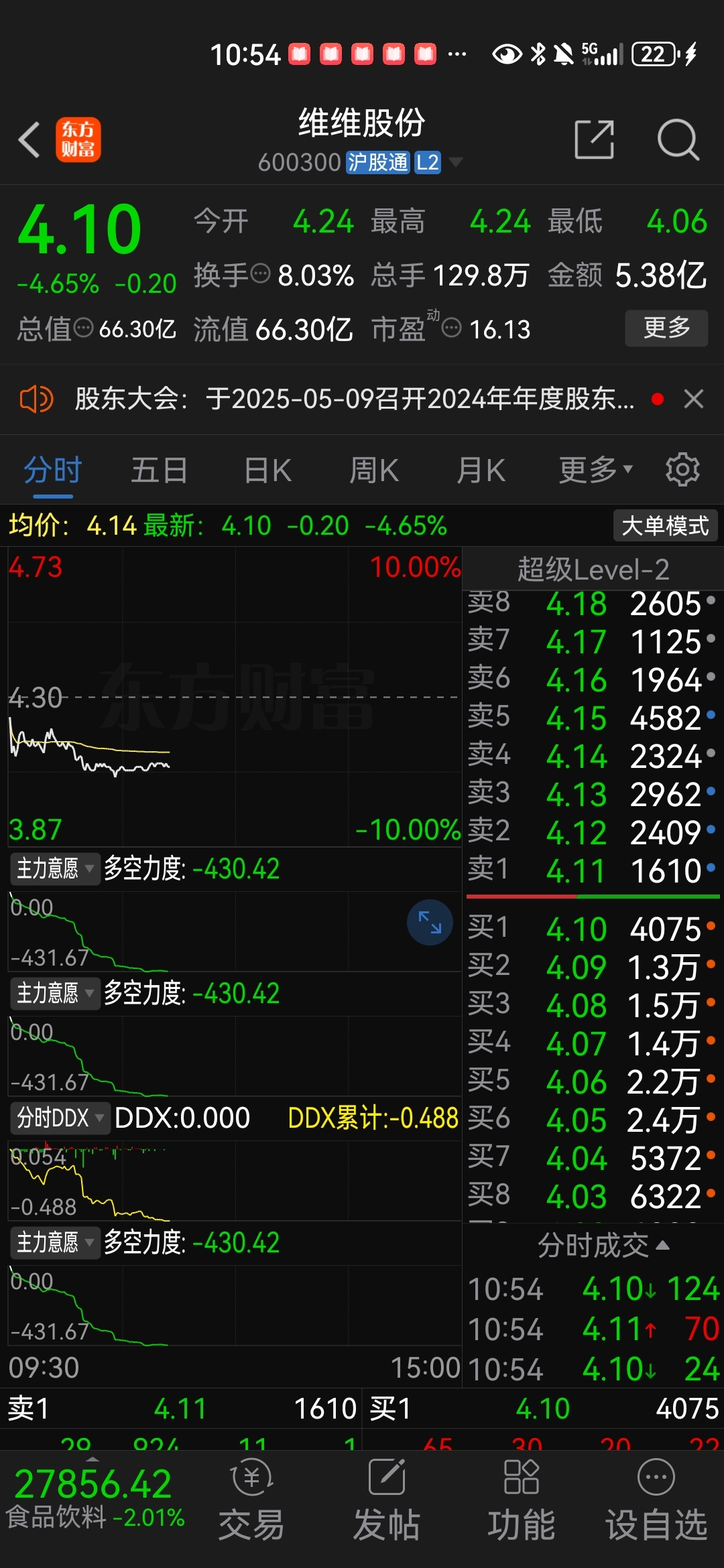 $维维股份(SH600300)$ 好了今天也可以提前下班了,收盘价4.12—4..08。