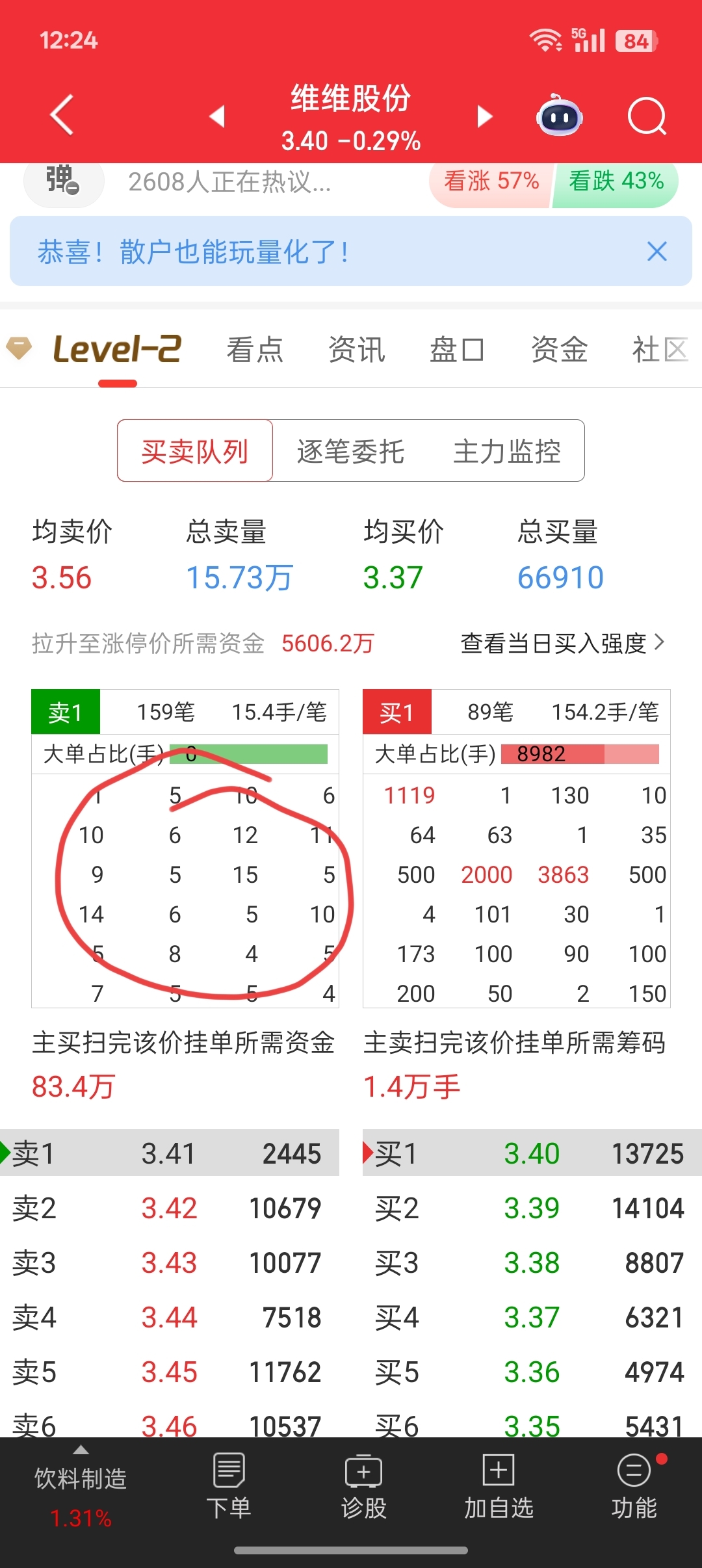 $维维股份(SH600300)$ 量化今天是压盘主力军,目前还未有超级主力进来打破僵局,快速拉升三个百分位,量化会反手做多!上午极致缩量,大家都很悲观,当你觉得不可能的时候,可能奇迹就会出现!