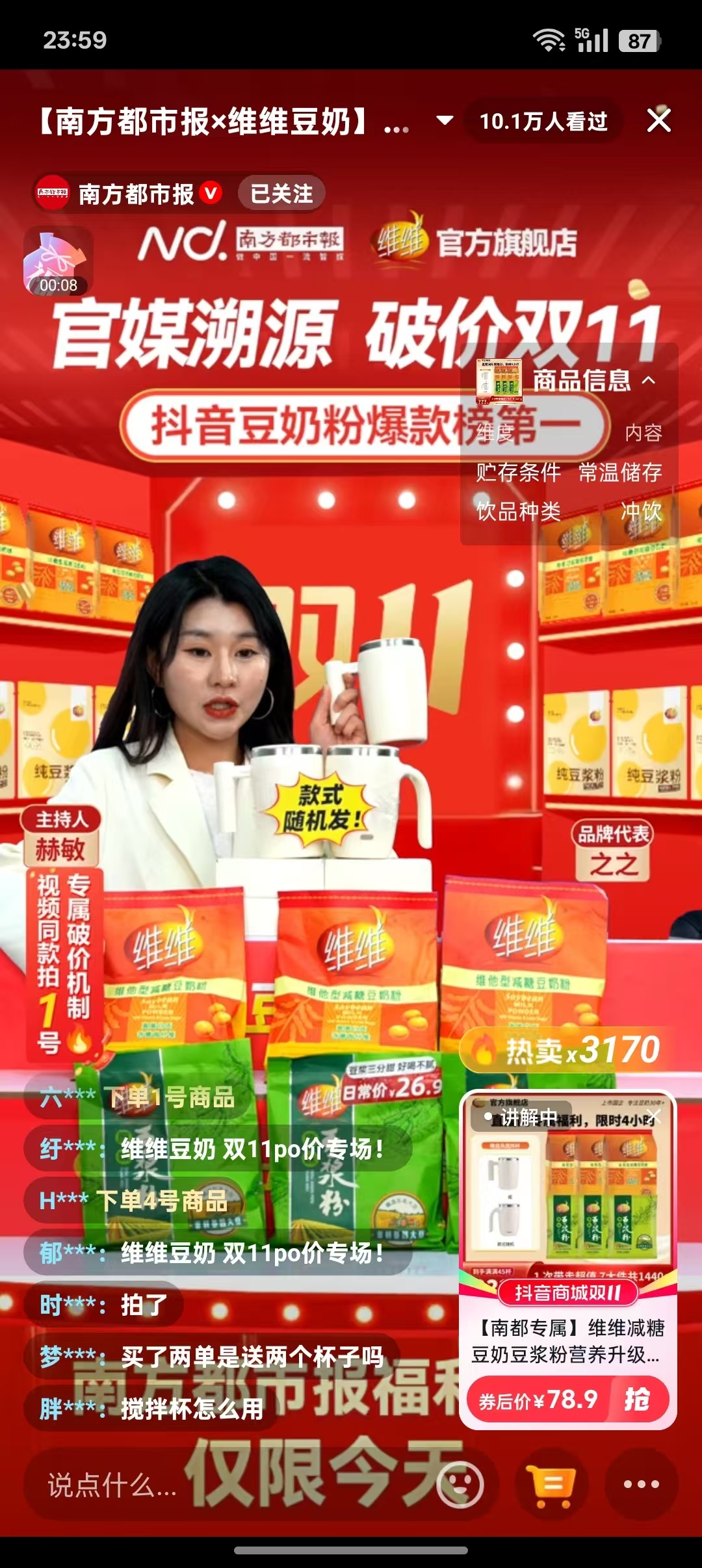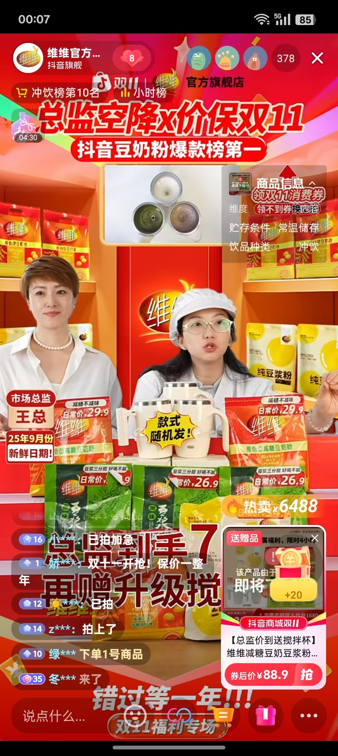 双直播间距离下播还有两小时,一号链接销量已近万单,单日电商渠道现在已经轻松突破1