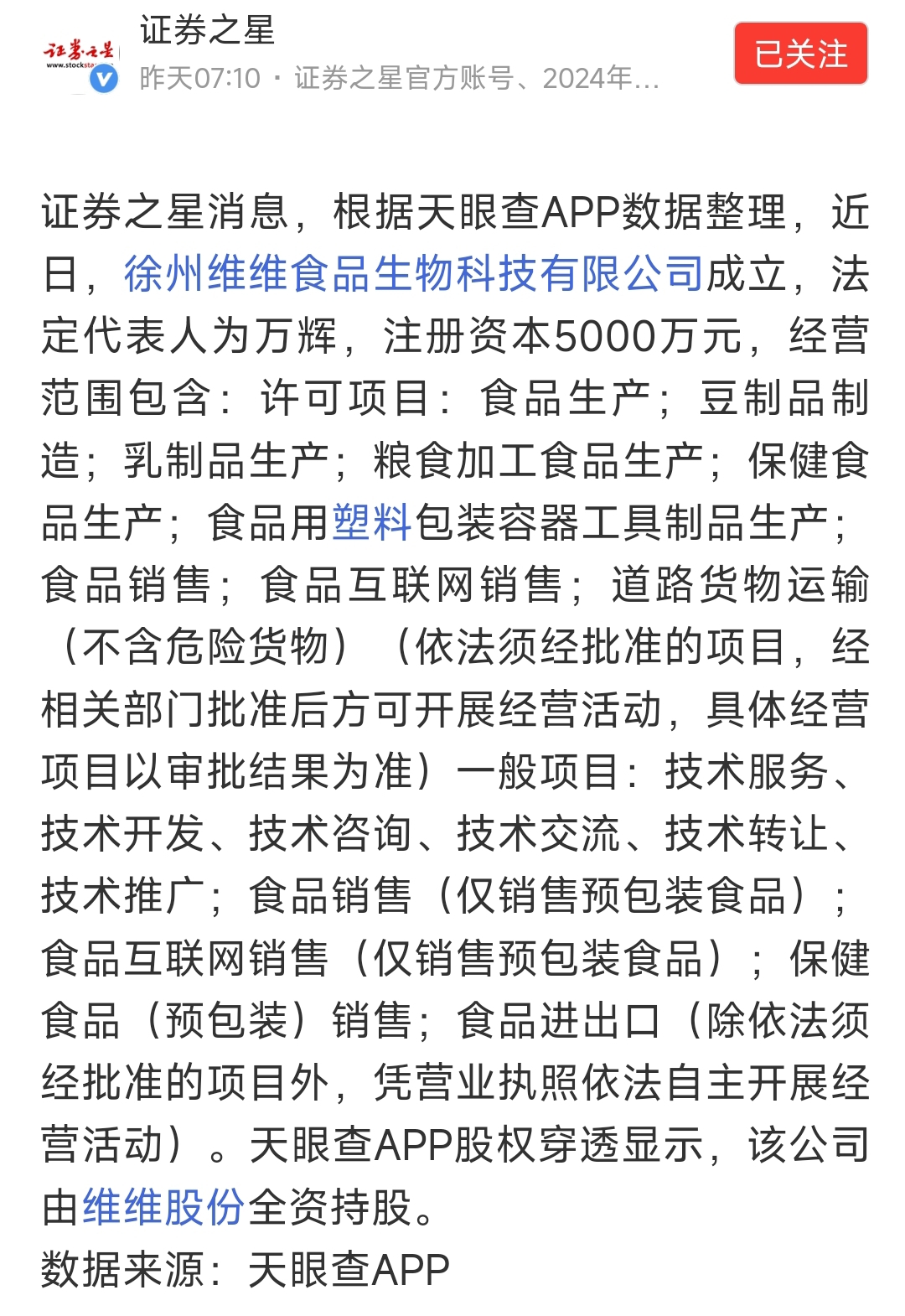 $维维股份(SH600300)$ 又成立一家科技公司。