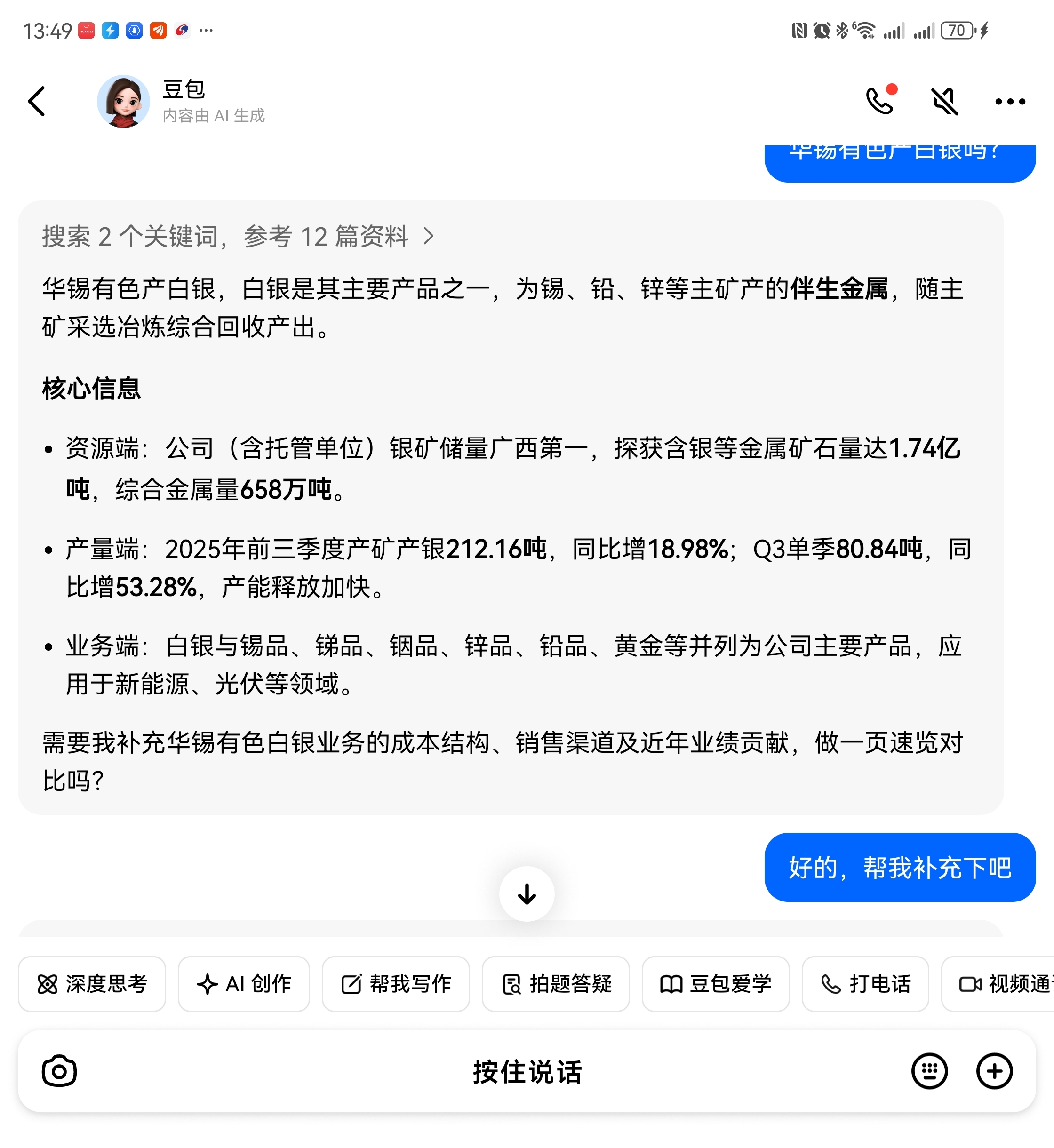 $华锡有色(SH600301)$ 华西锡有色居然有白银概念,一直觉得只是锡和锑,没想到白银还是居然是广西储量第一,让豆包更多的分析他,白银对他的业绩弹性极大。