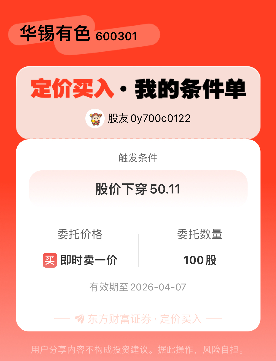 #条件单交流# #定价买入晒单# 一位股神设置了一个定价买入条件单,接下来就是见证奇迹的时刻~$华锡有色(SH600301)$