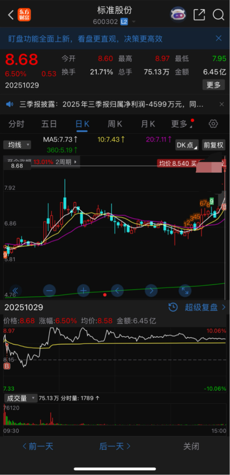 $标准股份(SH600302)$ 昨天8.5买高了,好在今天拉高能跑
