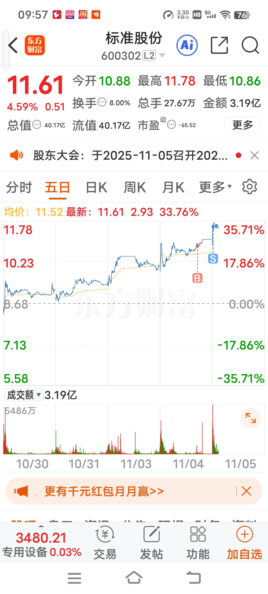 $标准股份(SH600302)$ 虽然今天我11.60卖了,但这票早上还是很强的看看下午还这么强没,只要尾盘不跌穿11.44尾盘再接回,做短线的落袋为安