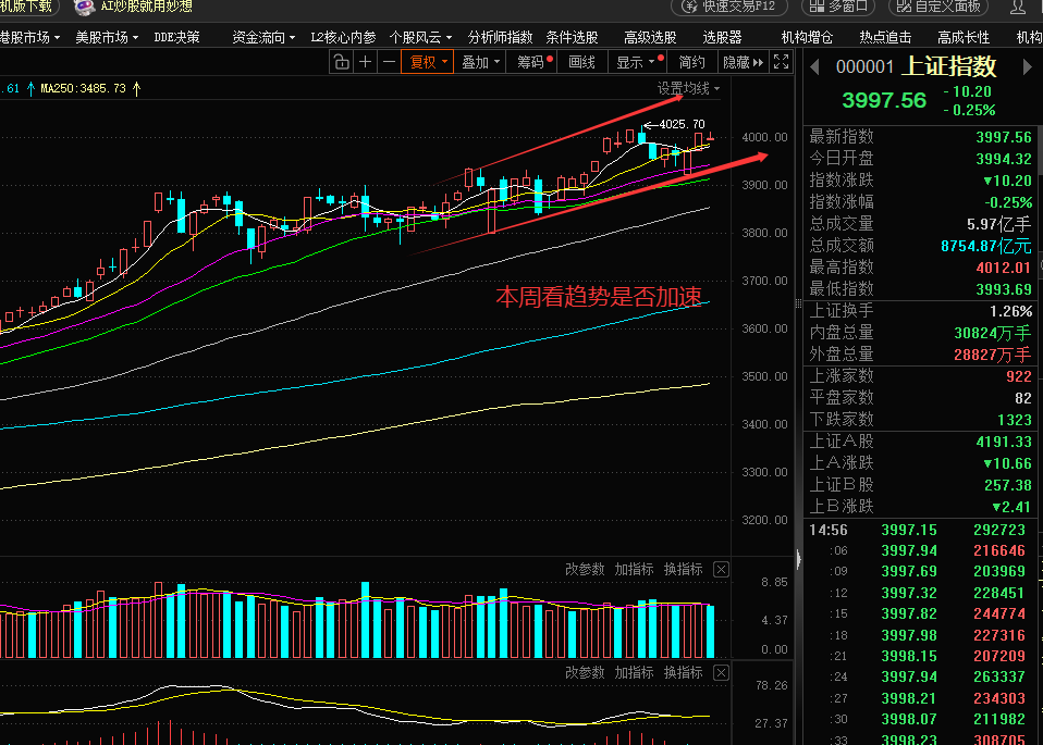 周五市场走势符合预判。市场早盘竞价小幅高开。开盘后指数震荡反弹,但是力度偏弱,全天就是围绕前一交易日点位横盘震荡为主,收盘微跌,K线收假阳十字星,成交量萎缩再回2万亿以下。周五市场未能延续前两天的强势,主要就是连续上涨后指标有修复需求,同时成交量不足,这里2万亿左右的成交量也就是维持市场在4000点附近震荡,要想向上攻击还略显不足,这里要有持续大体量热点板块出现,市场赚钱效应出来了,那么吸引增量资Z进场,市场才会开启新的上涨行情。好在现在大盘指数没有大的风险,现在就是精选板块个股操作就好了。