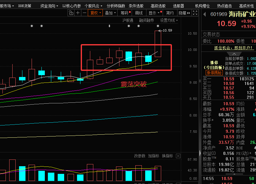 新能源转型+油气增产+流改善公司锂矿项目进入试生产阶段,氢氧化锂单日产量达40吨,新能源业务未来有望成为新的增长点,且现流显著改善,叠加海南封关的逻辑,近期突破震荡平台,技术走势来看,均线多头排列,如果周一海南板块竞价强势则可以分时承接够的时候介入,否则等待回踩均线。