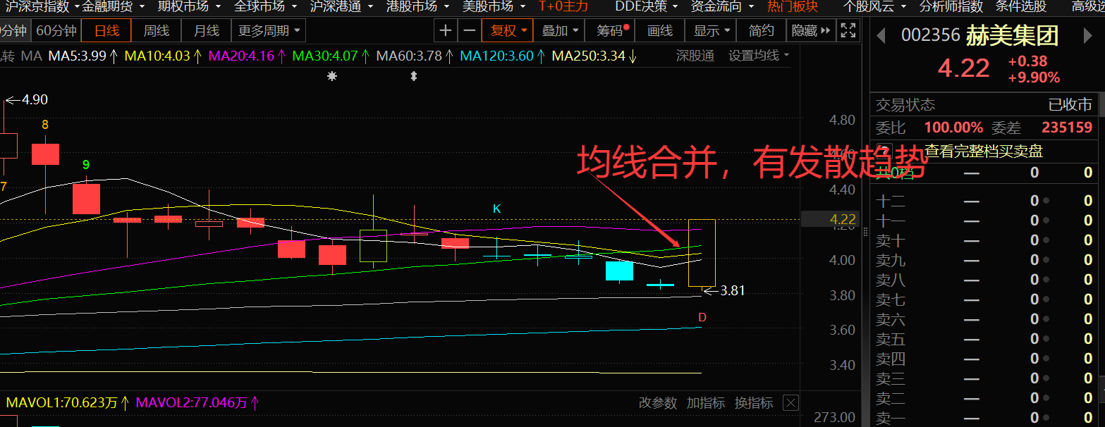 海南板块今天的新进个股,低价加上涨停频繁,而且赫美集团已经调整了一个多月,具备上涨的动能。昨天盘后海南还有利好消息,今天就看海南板块竞价能否走强,大家可以一并关注中国中免,康芝药业等几个明星股,如果出现板块效应,赫美的分时承接又好,就具备一进二的条件,可以低吸介入。