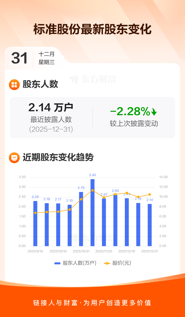 标准股份:截至12月31日最新股东户数2.14万户,较上期减少2.28%
