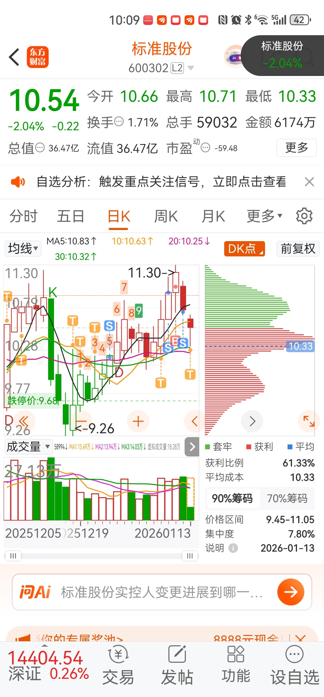 $标准股份(SH600302)$ 昨天看看走势不对,该割就割,今天我又来了。