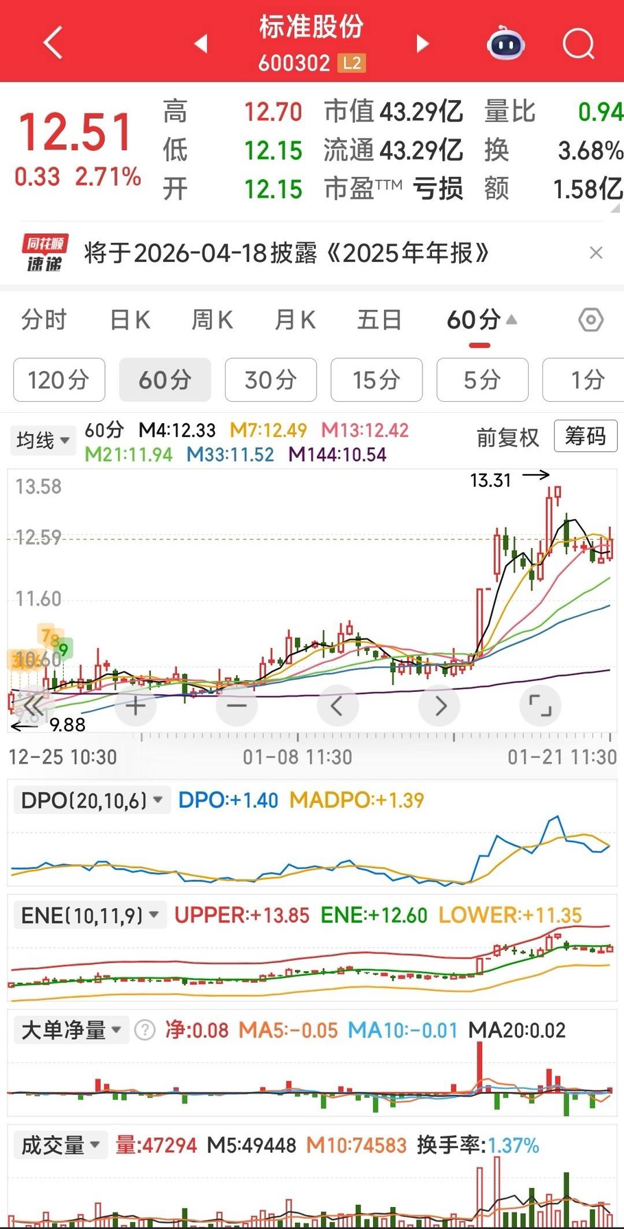 标准股份,上午收盘12.51元,离关键价位12.58元仅差7分。下午依然关注干掉