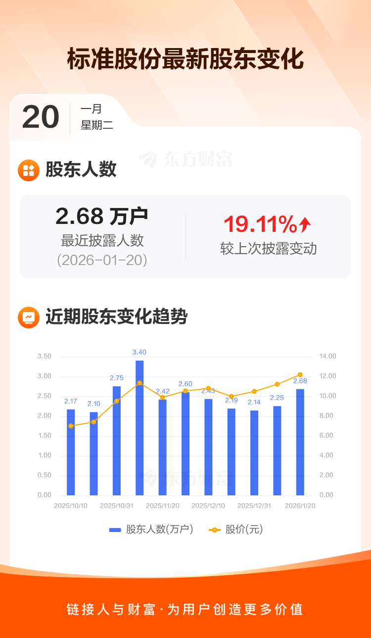 标准股份:截至1月20日最新股东户数2.68万户,较上期增加19.11%