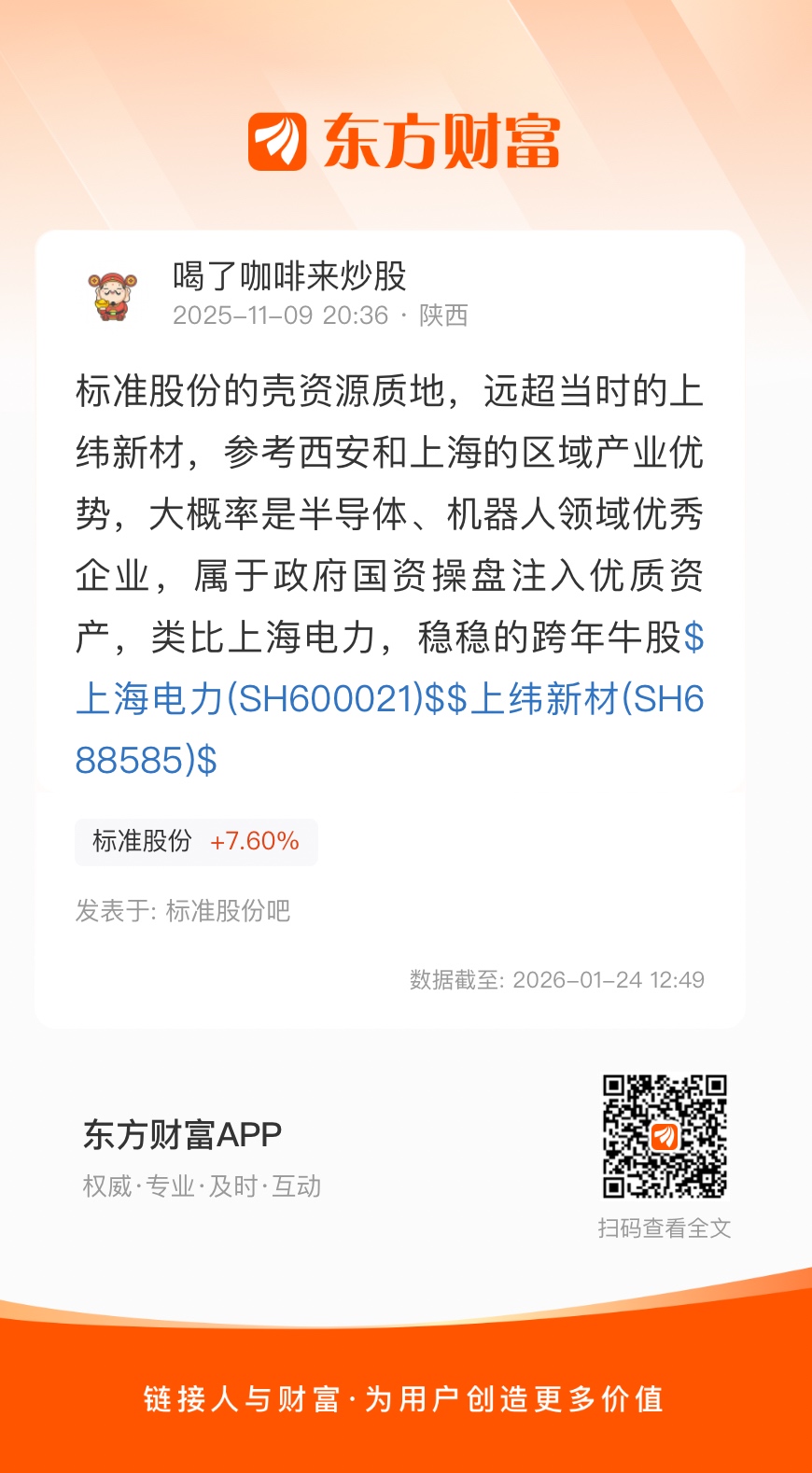 标准股份的壳资源质地,远超当时的上纬新材,参考西安和上海的区域产业优势,大概率是半导体、机器人领域优秀企业,属于政府国资操盘注入优质资产,类比上海电力,稳稳的跨年牛股$上海电力(SH600021)$$上纬新材(SH688585)$