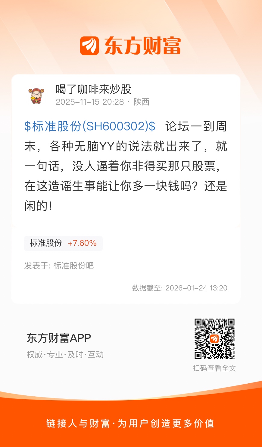 $标准股份(SH600302)$ 论坛一到周末,各种无脑YY的说法就出来了,就一句话,没人逼着你非得买那只股票,在这造谣生事能让你多一块钱吗?还是闲的!