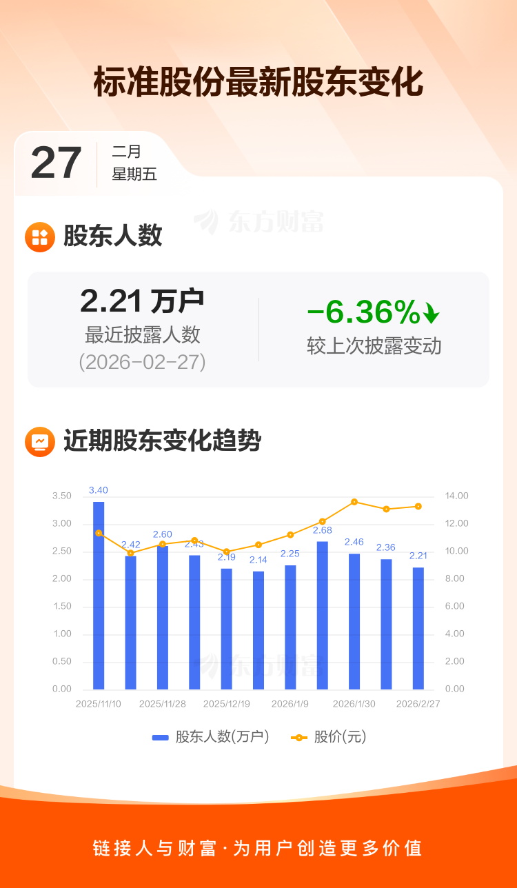 标准股份:截至2月27日最新股东户数2.21万户,较上期减少6.36%